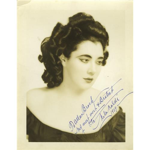 <B>Nita Naldi Autographed Portrait and Publicity Portrait.</B></I> The silent screen had no more lethal a vamp than Nita Naldi (1897-1961), whose dark beauty tormented two great stars in two classic films: John Barrymore in <I>Dr. Jekyll and Mr. Hyde</B></I> (1920) and Rudolph Valentino in <I>Blood and Sand</B></I> (1922). Giving every impression of emerging from some haven of European debauchery, Nita was actually Anita Donna Dooley of New York City, a Ziegfeld showgirl whose cinema image slinked its wicked way into male fantasies and wives' nightmares. Then came the Sound era - and Nita's New York accent put her out of the movie business. This lot incudes a wonderful 11" x 14" autographed portrait of Nita, signed twelve years after her final film - "To Allan Brock My most most and Bestest Etc. Nita Naldi." Also included is an 11" x 14" close-up of Nita in Egyptian headdress from <I>Lawful Larceny</B></I> (1923). The autographed portrait has the photographer's stamp on the back, and the publicity photo has the original snipe and is stamped "A .William Eglinton Photograph. Courtesy of Paramount Pictures." The autographed portrait as a small crease at the top of the left corner, far from the image - otherwise both items are in Excellent condition. Here's an evocative silent film name at her deliriously seductive best! <I>With COA from PSA/DNA.</B></I>