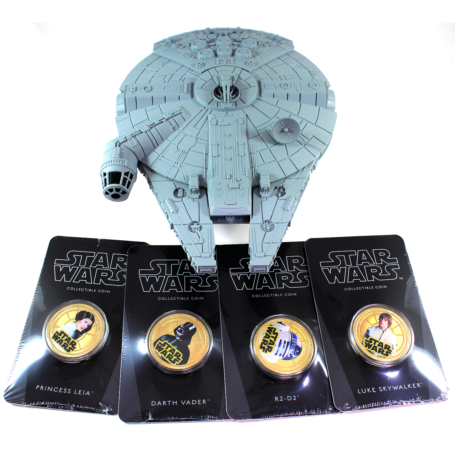 Each coin is 26g of gold plated coper-zinc, with selective colour. The characters in this set are Luke Skywalker, Princess Leia. Darth Vader, & R2-D2. Each coin is individually sealed. To open, the top of the ship comes off. Minor wear to outer box.