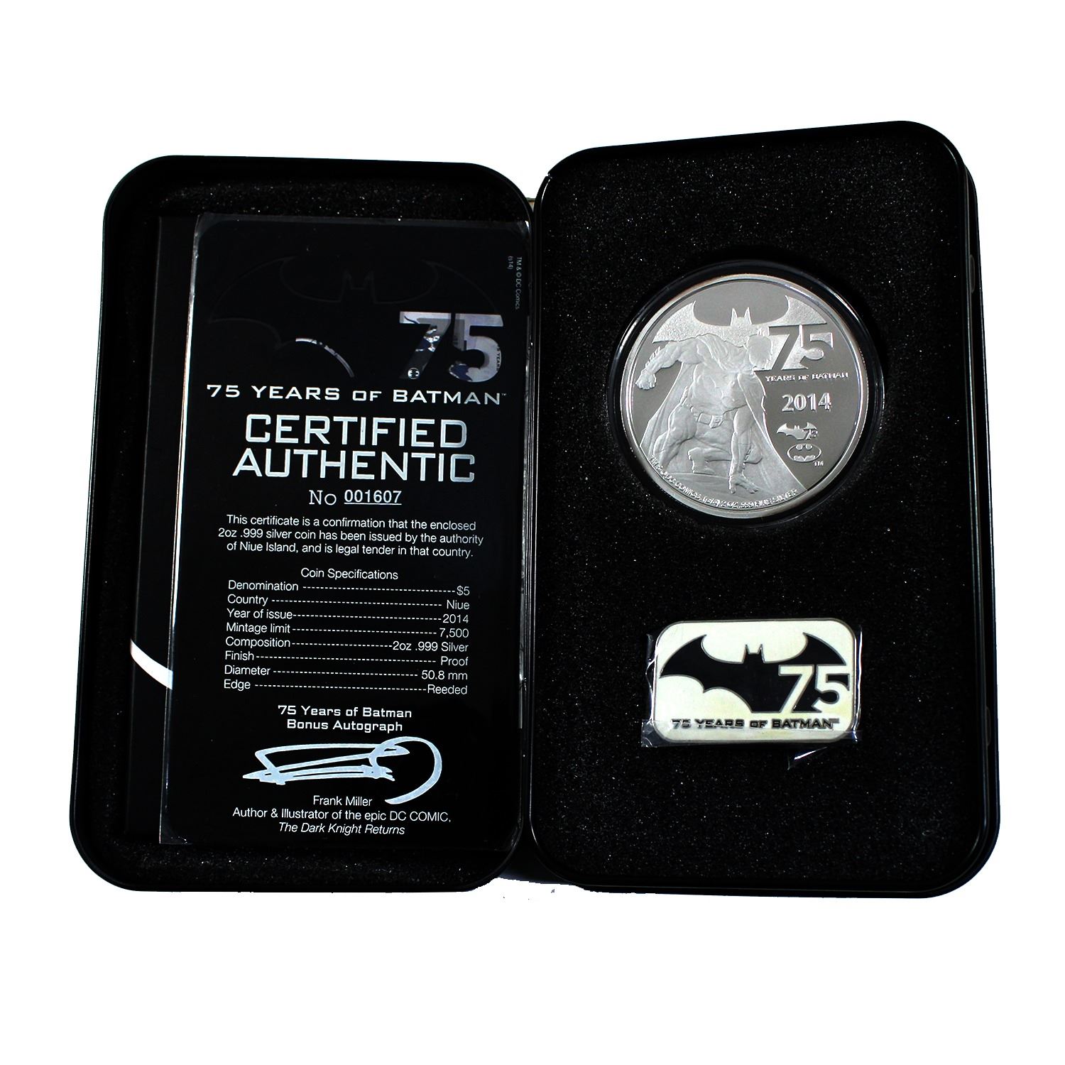 Niue 2014 $5 DC Comics-75 Years of Batman 2oz Fine Silver Proof. 1607/7500. Comes with deluxe collector's tin, metal COA, and accompanying pin. Pale golden tones throughout. Scuffed capsule (Tax Exempt)