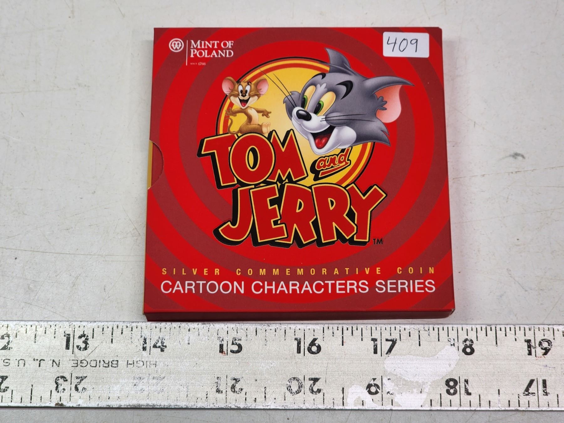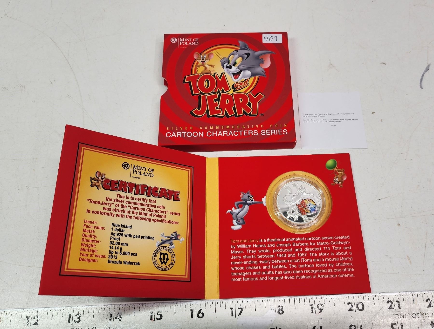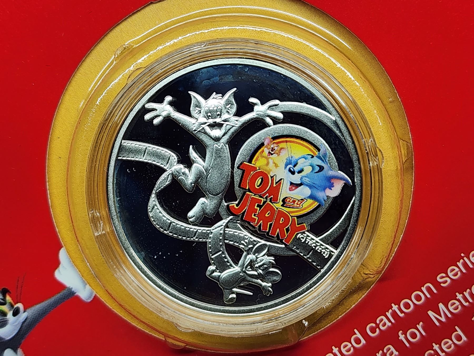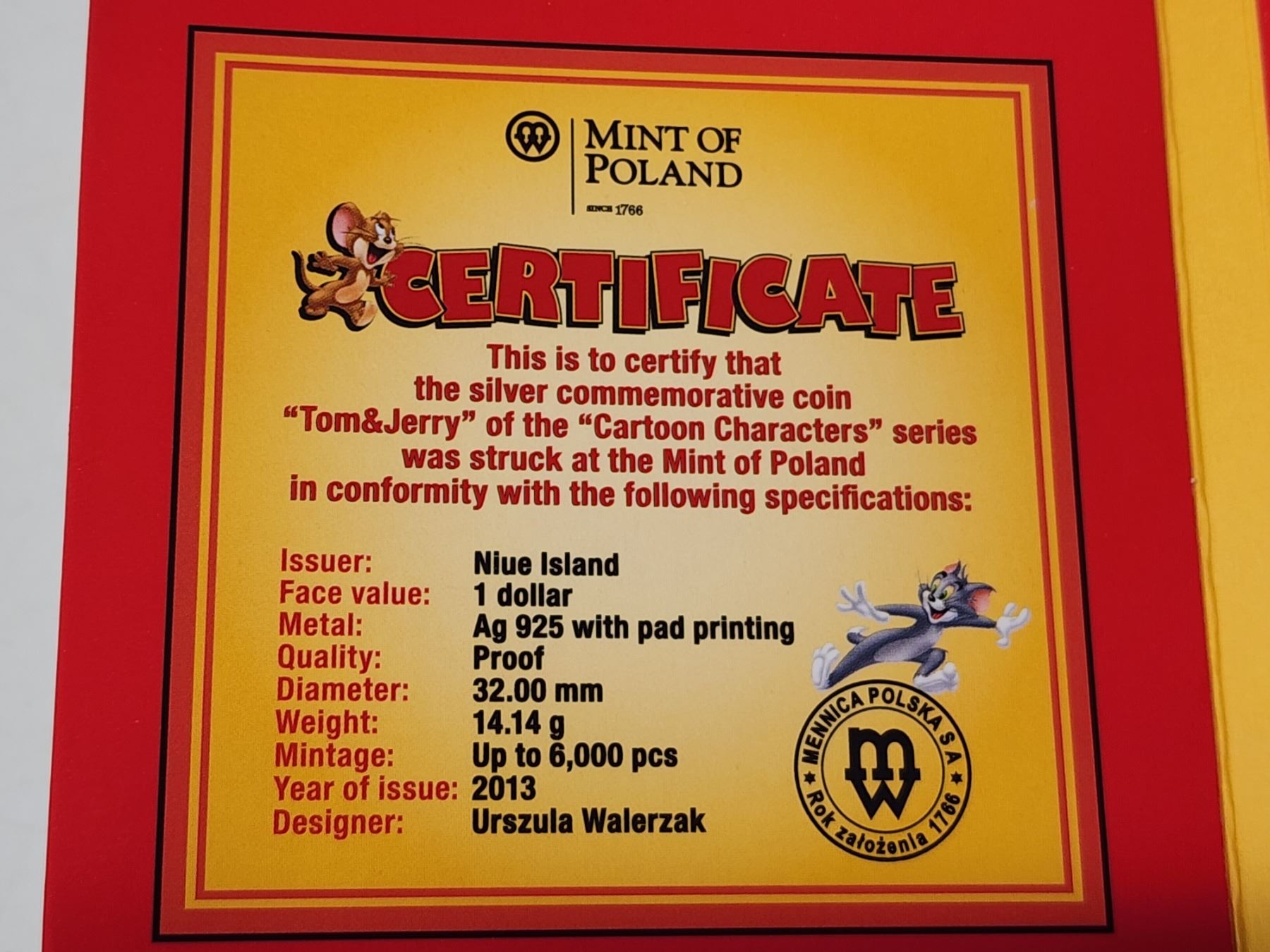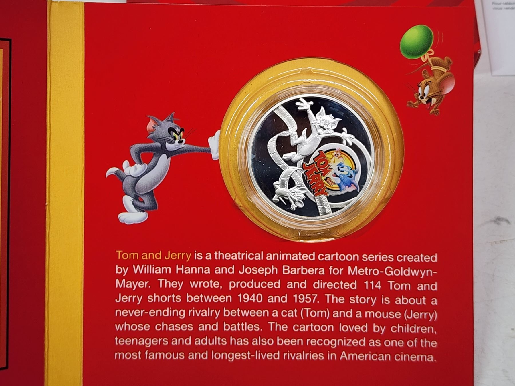 Niue. Colourized Tom & Jerry $1. Mintage of 6000 pieces. One Ounce Sterling Silver. Proof. Housed in its original folder of issue.