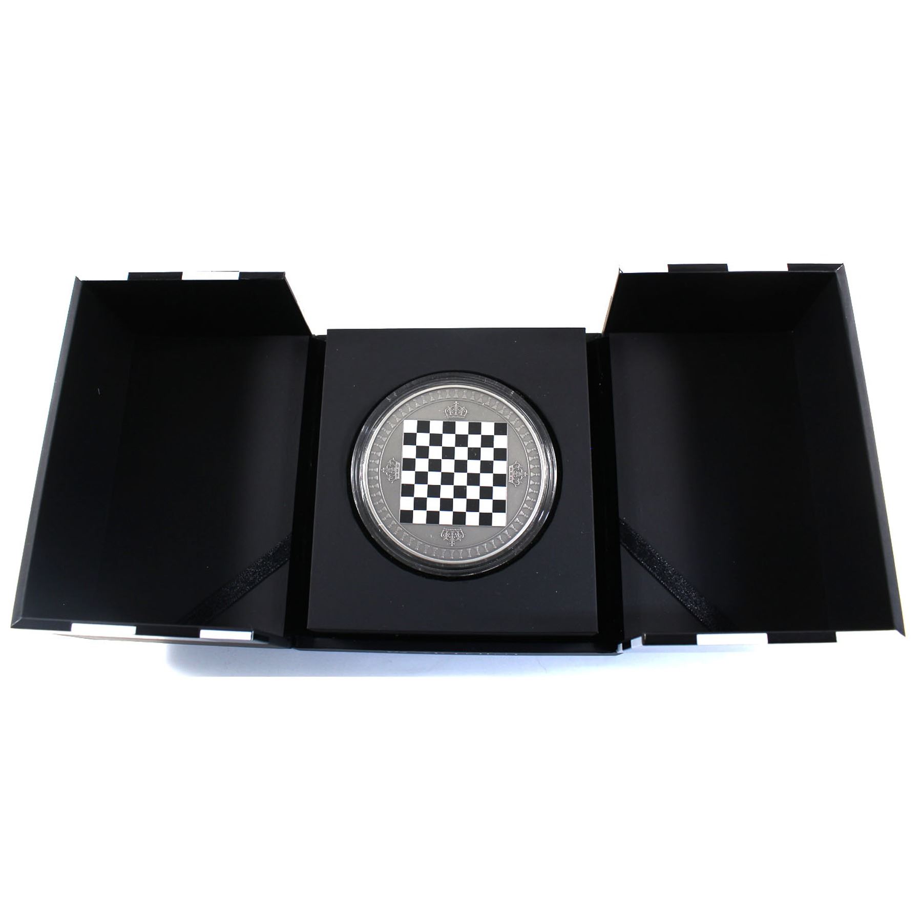 Niue Issue: 2018 $5 Chess 2oz Fine Silver Coin with Antique Finish & Chess Pieces (TAX Exempt). This limited mintage coin issued by the Art Mint in France comes encapsulated with COA '151/500', and 32 Chess Pieces. Displayed in an attractive Presentation Case.