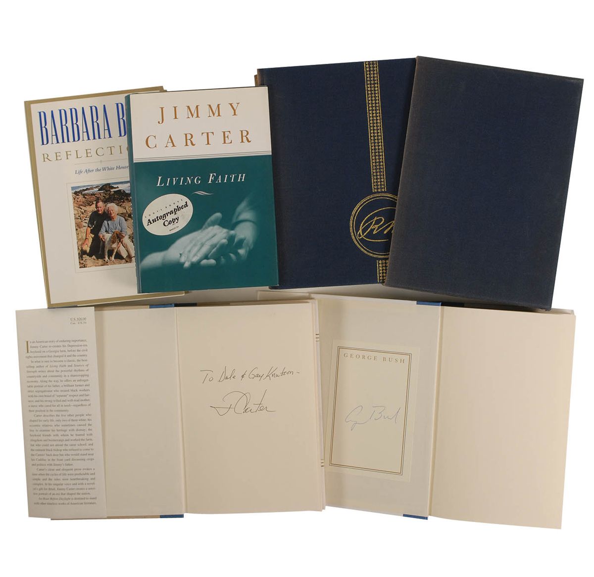 Five books: one hardcover with slipcase first edition of The Memoirs of Richard Nixon, signed on a special prefatory page by Nixon; one hardcover first edition of All the Best, signed on a bookplate affixed to the front pastedown by George Bush; one hardcover first edition of An Hour Before Daylight, signed and inscribed on the first free end page by Jimmy Carter; one hardcover Living Faith, signed on the first free end page by Jimmy Carter; and one hardcover first edition of Reflections, signed and inscribed on a bookplate affixed to the dedication page by Barbara Bush. The spine of the Nixon book faded and slightly loose, various dings to the covers, and a personal inscription and clipped dustjacket to one of the Carter books, otherwise fine condition.