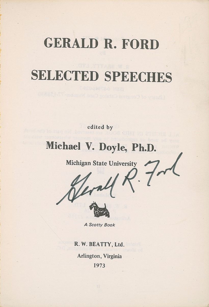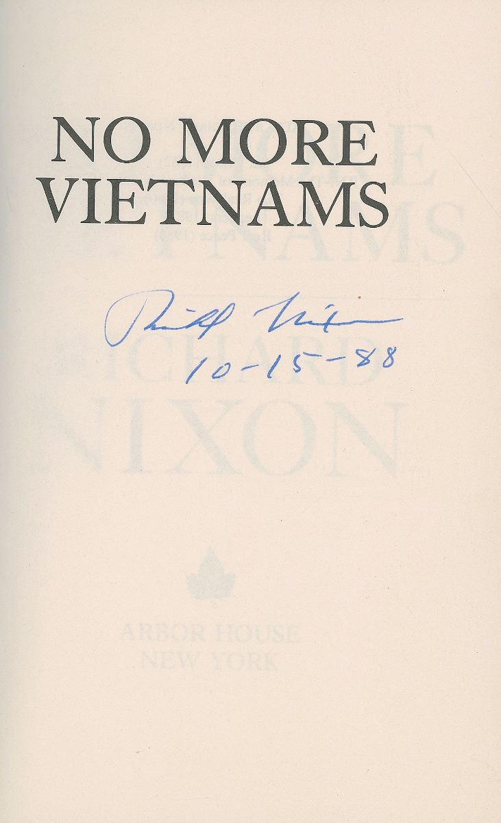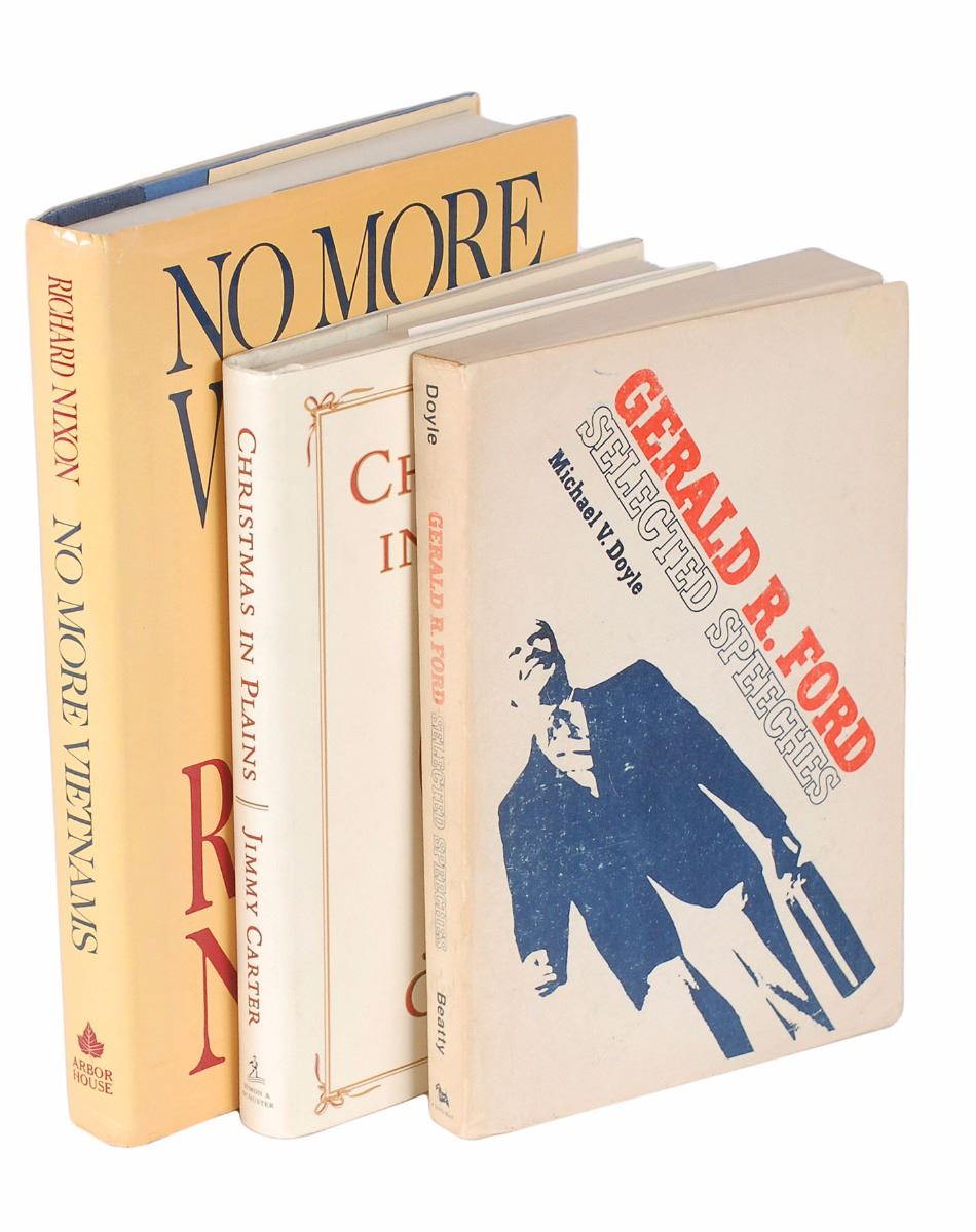 Three books: a softcover first edition of Selected Speeches, signed on the title page in black felt tip, “Gerald R. Ford”; a first edition of Christmas in Plains, hardcover with dust jacket, signed on the title page in black ballpoint, “J. Carter”; and a copy of No More Vietnams, hardcover with dust jacket, signed on the half-title page in blue ink, “Richard Nixon, 10-15-88.” In overall fine condition, with slight rubbing to the Ford covers, some creasing and wear to Nixon dust jacket, and a price label affixed to back of Carter dust jacket. Each book is accompanied by a laminated four-leaf clover, a unique hallmark the collector offered in trades for autographs.