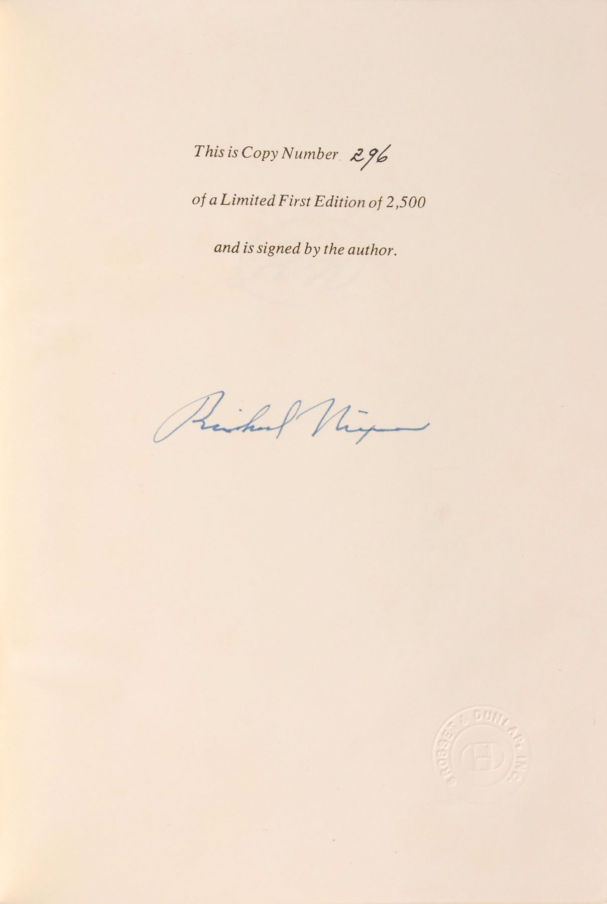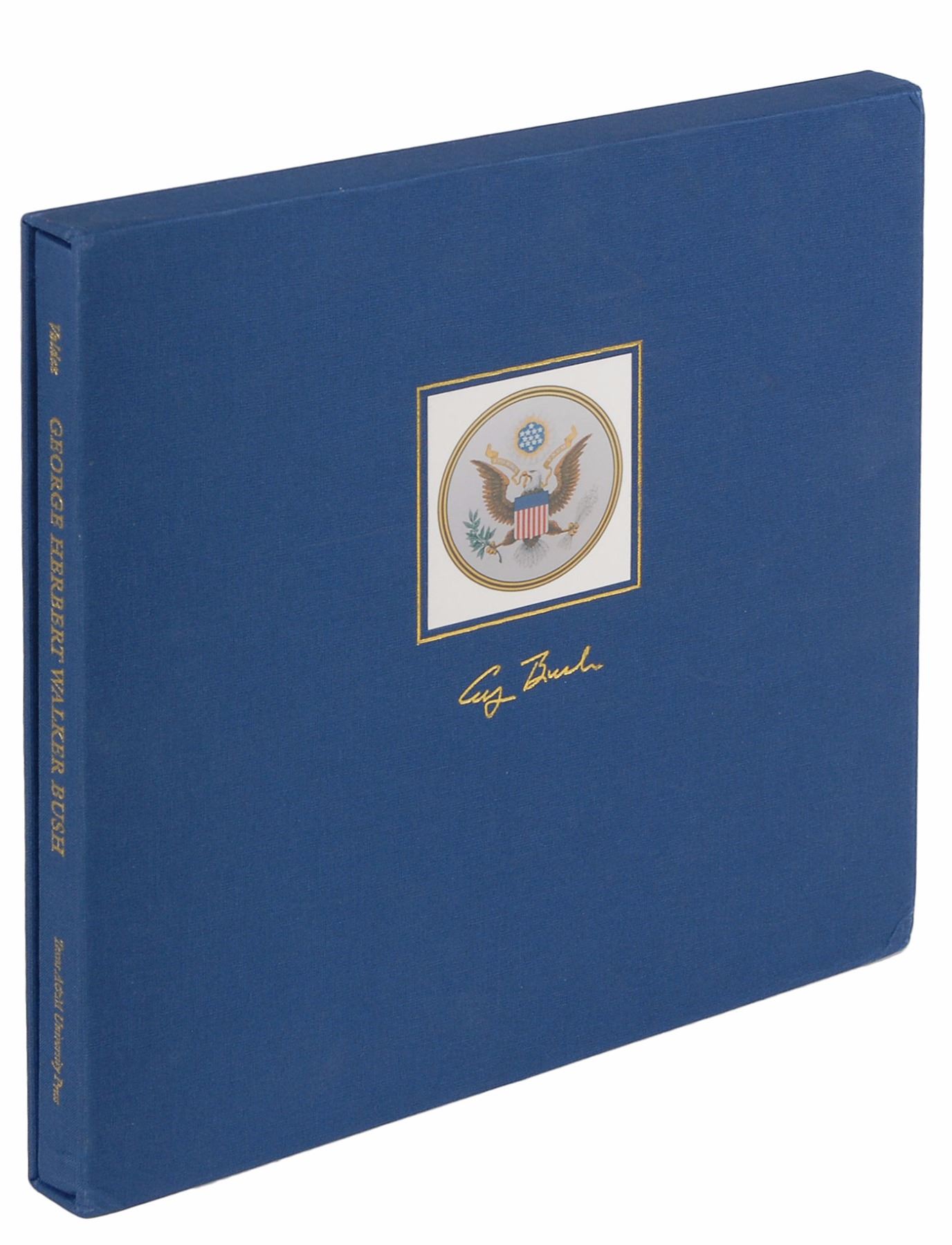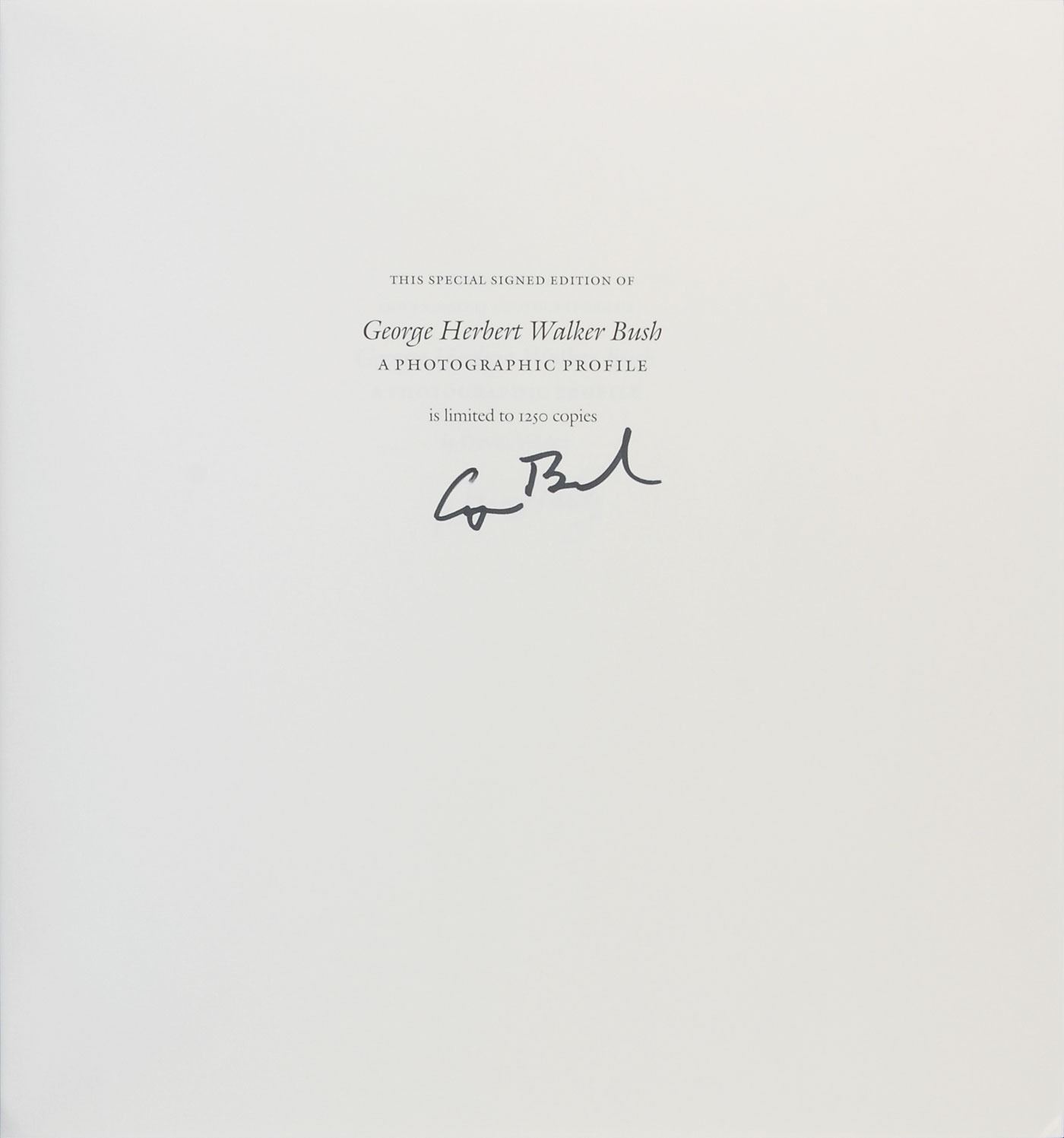 Three books: a first edition of Portrait of the Assassin, hardcover with dust jacket, published by Simon & Schuster in 1965, signed on the first free end page in black felt tip, “Gerald R. Ford”; a limited first edition of The Memoirs of Richard Nixon, leather-bound hardcover, numbered 296/2500, published by Grosset & Dunlap in 1978, signed and inscribed on a bookplate affixed to the first free end page in black ink, “Clark Brown, Jr., with deep appreciation for his friendship, from Richard Nixon, 6–7–78,” with Nixon signing again on the colophon in blue ink; and a first edition of George Herbert Walker Bush: A Photographic Profile, limited issue of 1250 copies, hardcover with slipcase, published by College Station: Texas A&M University Press in 1997, signed in black felt tip on the colophon, “George Bush,” and signed in black felt tip on the following page by photographer David Valdez. In overall fine condition.