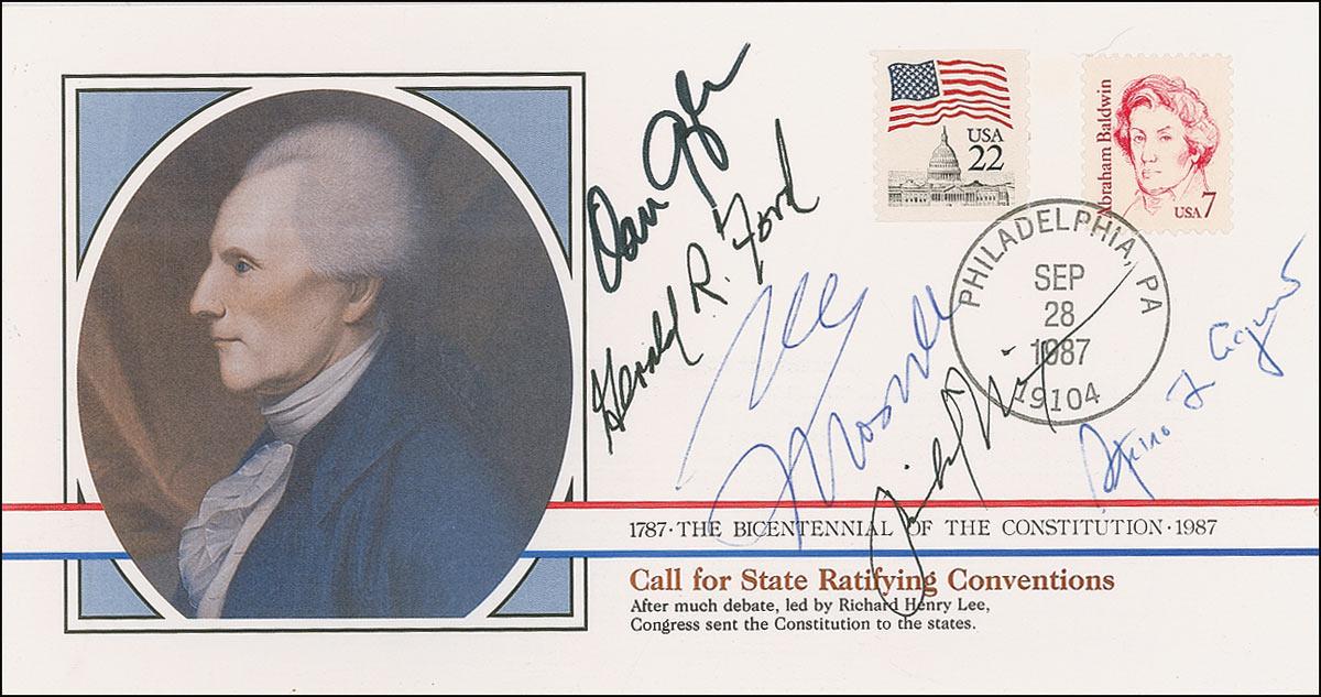Commemorative cover with a cachet honoring the Constitution bicentennial, signed on the front in ink and felt tip by Richard Nixon, Gerald Ford, Walter Mondale, Spiro Agnew, and Dan Quayle. In very fine condition.