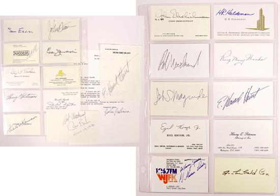[Nixon Richard M.] Watergate Signatures. Twenty signatures, most on business cards, of people who were involved in the Watergate scandal which caused President Nixon to resign the presidency on March 8, 1974, in the face of certain impeachment and removal from office. The signatures include those of people involved in the break-in and burglary of the Democratic National Committee offices, and of the cover up and/or destruction of incriminating documents: G. Gordon Liddy; E. Howard Hunt (2); Nixon's Chief of Staff H.R. Haldeman, his aide John Ehrlichman, White House council John Dean; Jeb Magruder; Nixon's secretary Rosemary Woods, who "accidentally" erased 18 minutes of key evidence on Nixon's tapes; Nixon lawyer Herbert W. Kalmbach, who paid hush money to the burglars; "dirty tricks" tactician Donald Segretti and Special Assistant to the President, Dwight L. Chapin who hired Segretti; Egil Krogh, Jr, head of the Special Investications Unit in the White House known as the "Plumbers".
