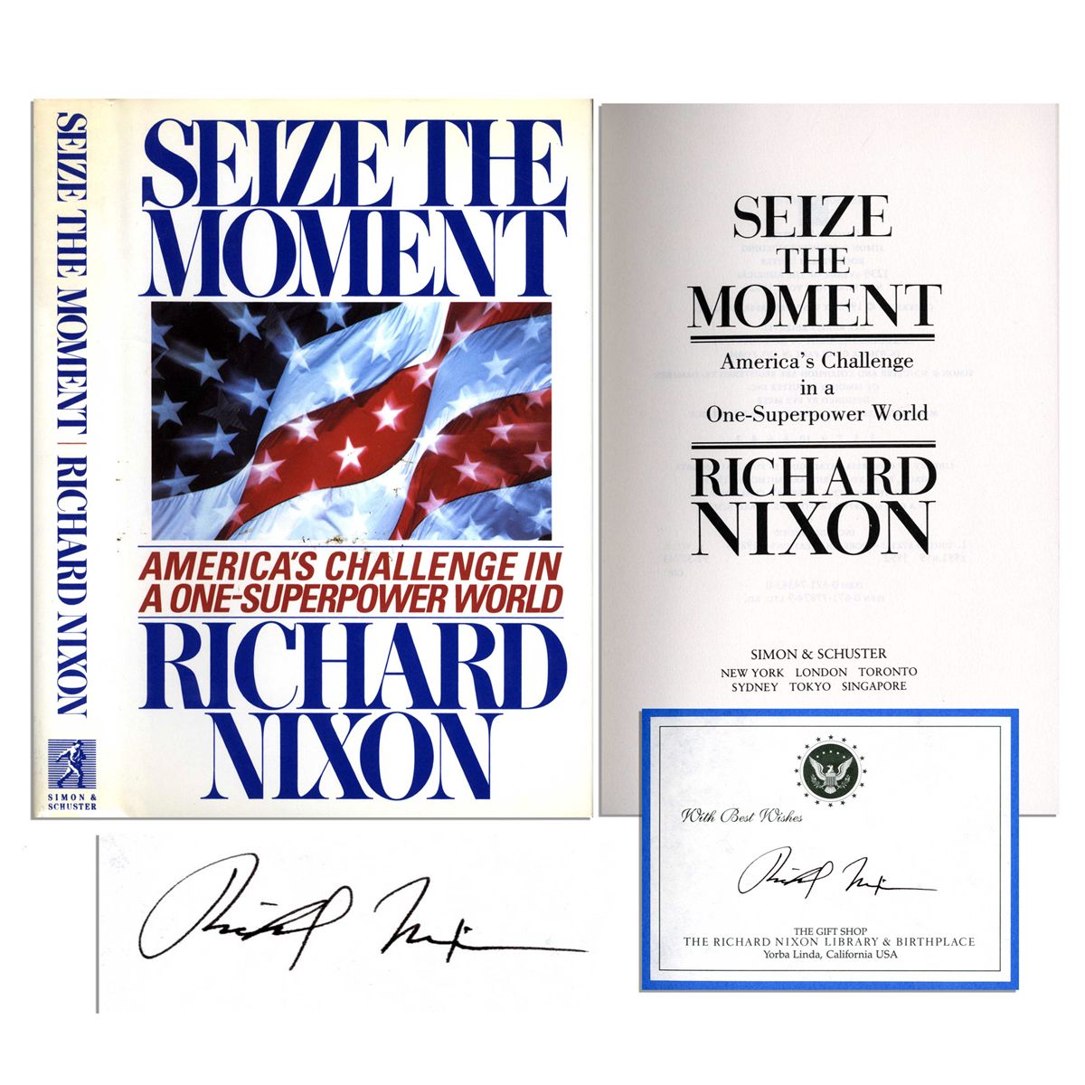 Signed copy of Richard Nixon's book ''Seize The Moment / America's Challenge in a One-Superpower World.'' Simon & Schuster: New York: 1992. Nixon signs a Nixon Library bookplate affixed to the front free endpaper in black ink. Here, Nixon reveals his vision for the United States after the collapse of the Soviet Union. Attractively bound in blue boards with navy blue linen spine and gilt lettering. Light yellow stain to dustjacket front cover, else fine.