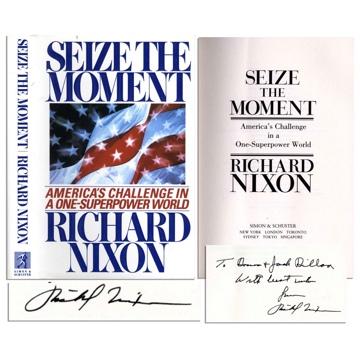 Signed copy of Richard Nixon's book ''Seize The Moment / America's Challenge in a One-Superpower World.'' Simon & Schuster: New York: 1992. Nixon signs the fly-leaf in black ink: ''To Donna and Josh Dilloa / With best wishes / from Richard Nixon''. In the book, Nixon reveals his vision for the United States after the collapse of the Soviet Union. Attractively bound in blue boards with navy blue linen spine and gilt lettering. Minimal wear to duskjacket, else fine.