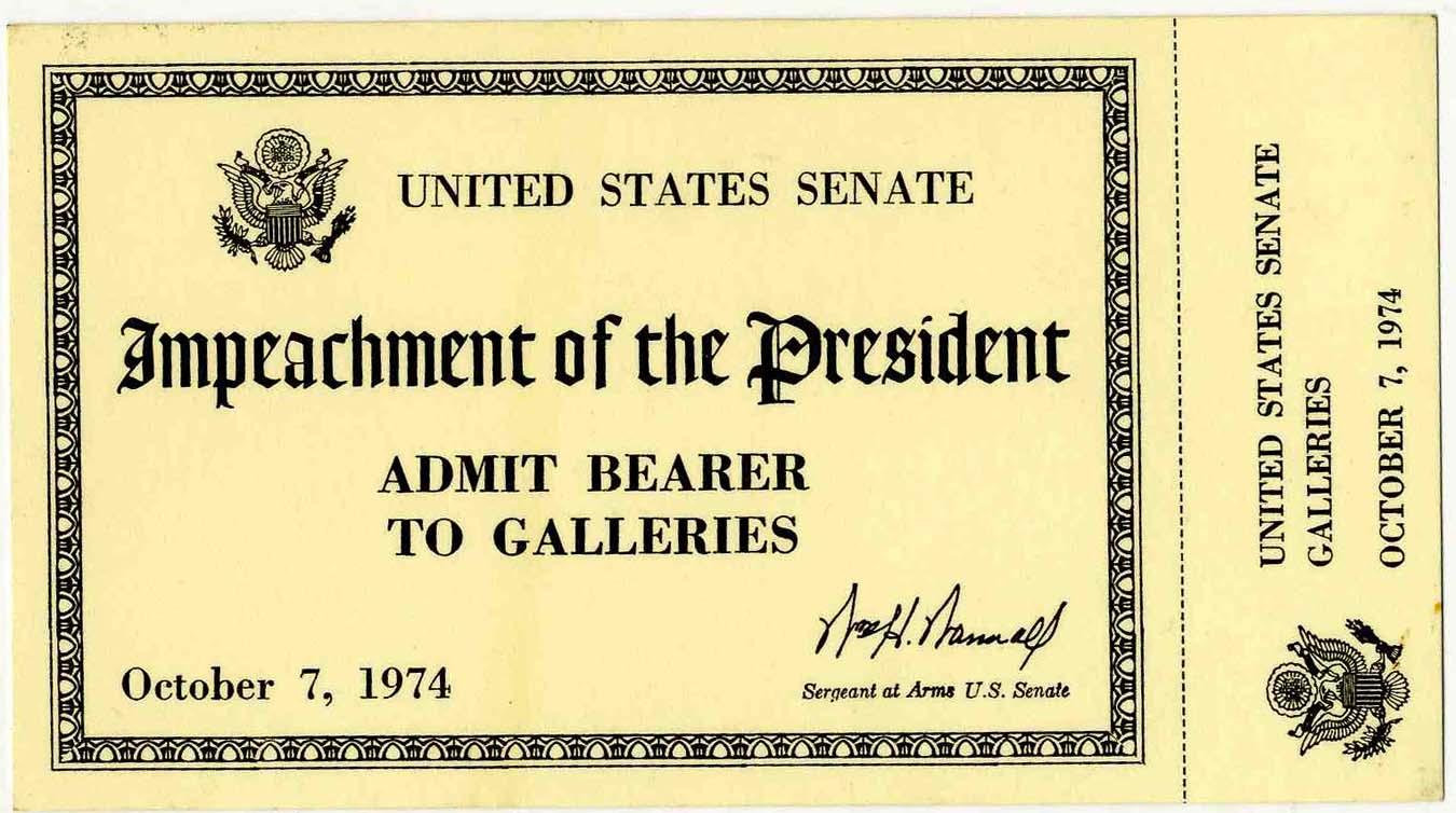 Rare Senate impeachment ticket to the trial of President Richard Nixon. Reads: ''United States Senate, Impeachment of the President, Admit Bearer to Galleries, October 7, 1974.'' With facsimile signature of the U.S. Senate's Sergeant at Arms. Ticket stub, still intact, reads: ''United States Senate Galleries, October 7, 1974.'' Nixon's ultimate resignation on 9 August nullified these tickets, which had already been printed. Measuring 5'' x 2.75'', ticket is in near fine condition.