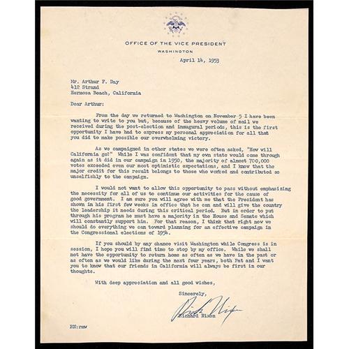 <Our item number 135783><B>Nixon, Richard M.</B> (1913-94) 37th President of the United States (1969-74) Typed letter signed ("Dick Nixon") as Vice President, on Office of the Vice President letterhead, 1p, 10 x 8 in., Washington, 14 April 1953. To Arthur F. Day in Hermosa Beach, California, thanking him for his help in insuring that California voted overwhelmingly for Eisenhower and assuring him that "Pat and I want you to know that our friends in California will always be first in our thoughts." Fine; light toning. <BR>Estimated Value $150 - 200. <BR><BR>Our item number 135783<BR><IMAGES><P ALIGN="CENTER"><IMG SRC="http://www.goldbergcoins.net/liveauction/49jpegs/135783.jpg"> </P></IMAGES>