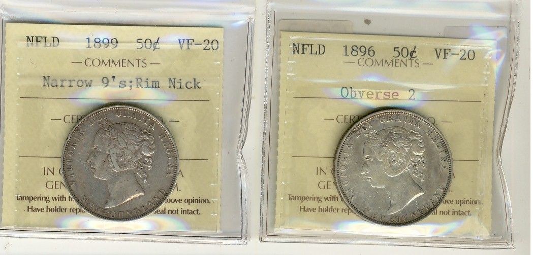 Nlfd 1896 50¢ Obv 2 & 1899 Nar Rim ICCS VF20. Lot of 2 ICCS coins with 1899 designated rim nick.