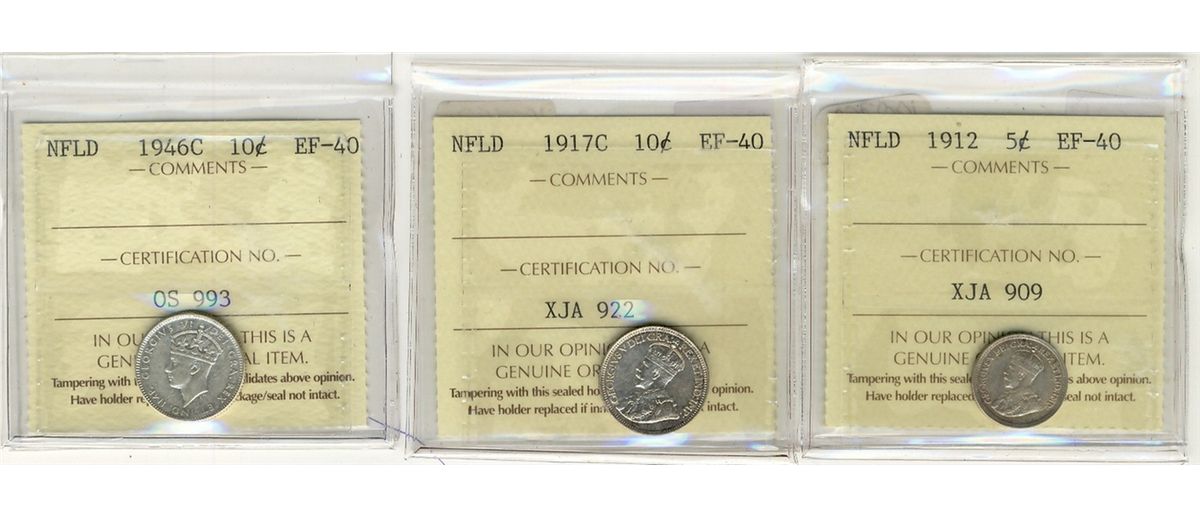 Nlfd 1912 5¢, 1917c 10¢ & 1946c ICCS EF40. Lot of 3 coins.