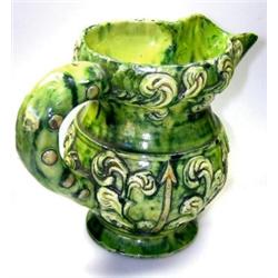 'No.151', a green jug, the rim applied with a foliage band, upright scrolls of foliage alternating with pink tinged yellow arrows on the body, incised and sprig marks, 16.5cm high (R) £50-70