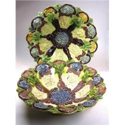 'No.179', two mask dishes, the rims typically applied with brown C-shaped brackets enclosing blue flowers alternating with red on one and yellow flowers on the other in brown vases separating the cream masks with titles above and radiating about the central blue Gothic roundels, the red flowered and incised dish 25cm diameter, the other 26cm, both with castle sprig marks (W) (2) £150-200