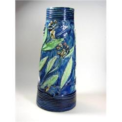 'No.37', a tall blue mug, the tapering sides applied with green leaves and red berries between horizontal reeded bands, the handle lacking, incised and sprig marks, 28cm high (D) £40-60