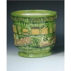 'No.57', a yellow sprigged green planter, the rim of the slightly tapering cylindrical sides with pink raised lettering 'Antiloce Va Cresces Avi Hierax Va Olympae' above a band of objects and a band of charioteers with pink horses, incised and sprig marks, 20.5cm high (R) £80-120