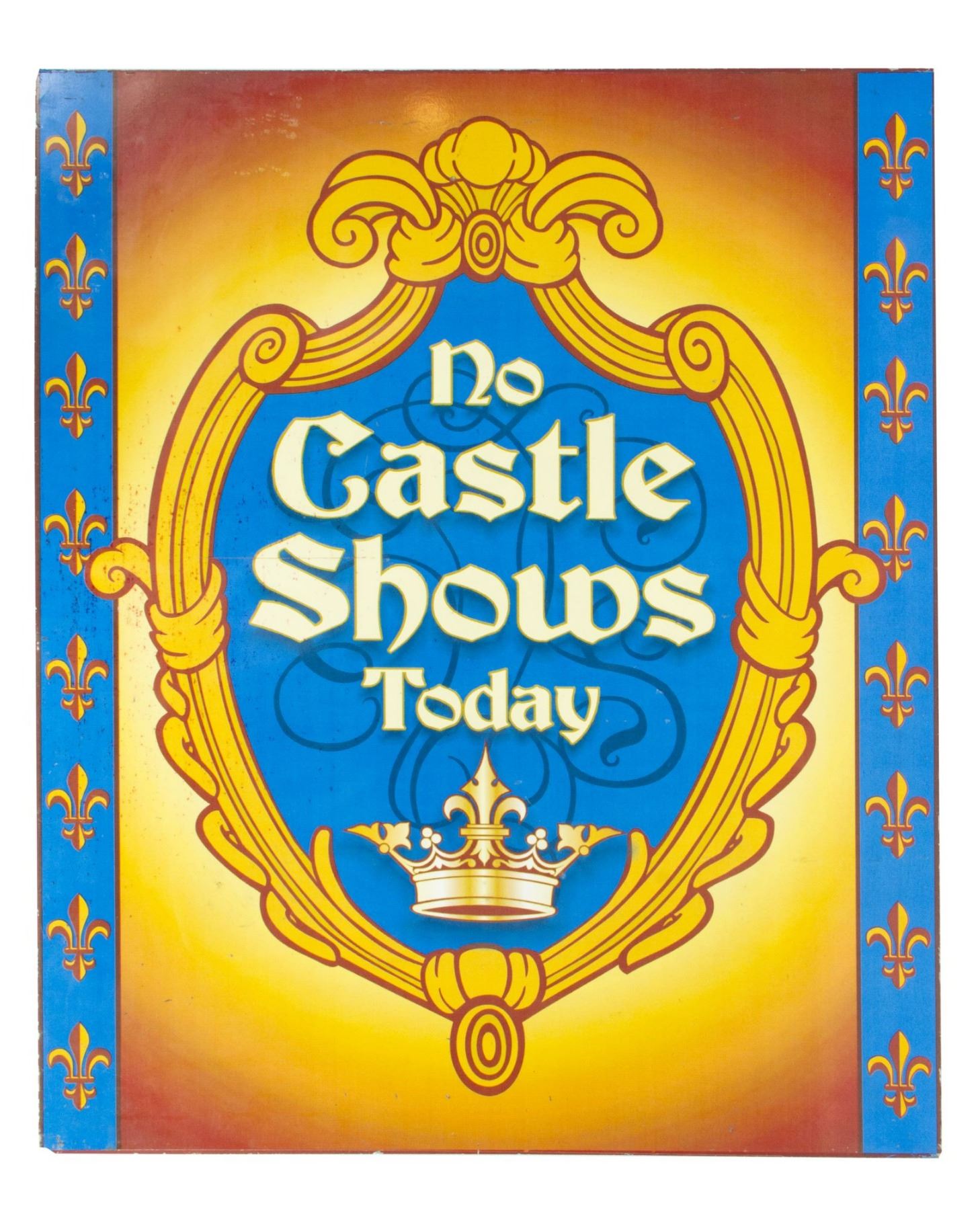 (Disneyland, c.1990s-2000s) A rare large metal sign from Fantasyland at Disneyland. The sign reads "No Castle Shows Today" with royal imagery printed on the large metal sheet. Measuring 30"x24.5", the sign is in fair condition with moderate wear from use, including some scratches and scattered areas of red color in portions of the imagery.