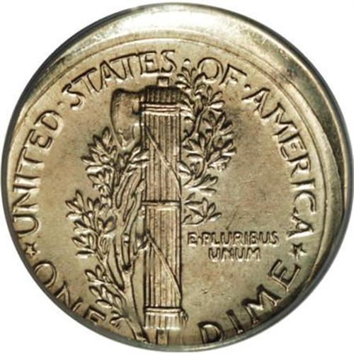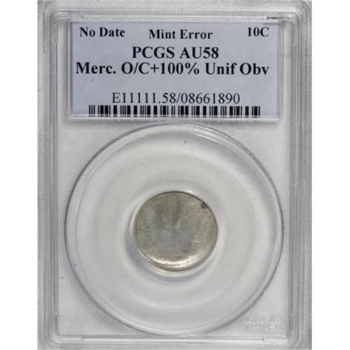<B>Undated Mercury Dime--Struck Off-Center With Blank Obverse--AU58 PCGS.</B></I> A surprising error that likely resulted when two planchets were fed into the dies at the same time, slightly off-center. The other planchet shielded this piece from the obverse die, though the other side received an impression from the reverse die. While this lightly rubbed example would not qualify as Full Bands, the strike is sharp, and only a touch of patina is present in the lightly marked fields.<BR><BR><B>Coin Engraver:</B> Adolph A. Weinman<BR><BR><b>Shipping:</b> Coins & Currency (<a target="_blank" href="http://www.heritageauctions.com/common/shipping.php">view shipping information</a>)