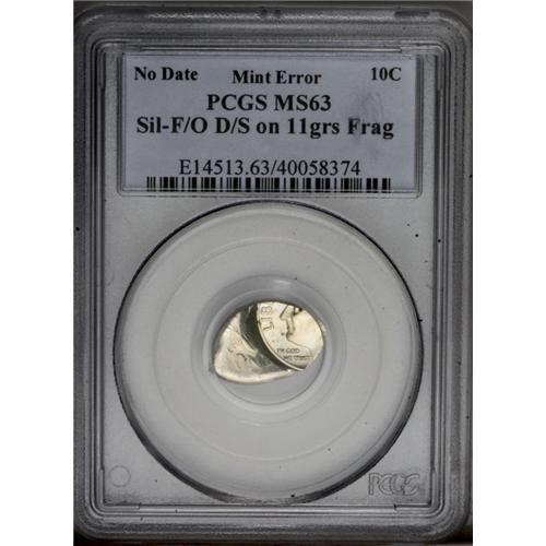<B>Undated<10C> Roosevelt Dime--Flipover Double Strike on a Silver Fragment--MS63 PCGS.</B></I> 11 grains. A small fragment of a silver planchet found its way into the coining dies. Upon striking, the fragment momentarily adhered to one of the dies and subsequently flipped over and did not eject, thus receiving another blow of the press. This resulted in both obverse and reverse details being visible on each side. Fully brilliant and highly lustrous, a highly unusual error coin. <BR><BR><B>Important notice:</B> Heritage usually auctions material at the rate of 200-250 lots per hour. On some occasions eBay Live bid software or the Internet may not be able to keep up with the pace of the auction. We recommend placing a realistic absentee bid now as insurance to avoid disappointment. Occasionally the auctioneer may eliminate or reject an eBay Live bid, and the auctioneer may also reopen a lot after the close of the eBay live bidding (usually because we missed an audience bid), and may reject your bid even if it shows you as the winning bidder. By bidding via eBay Live, you agree that Heritage may award the lot to another bidder at its sole discretion under the circumstances described above or any other reasonable circumstances. Since eBay bids are not shown to us until we open the lot on the floor, we treat those bids just like floor bids. In most cases the floor responds before the eBay bid is presented to us, due to Internet lag time, so for consistency we have made it a policy that floor bids are always considered first over tie eBay live bids. Also please note that all Heritage lots purchased through eBay Live carry a 20% Buyer's Premium. Please make sure you read the Terms and Conditions before you bid. This lot is being auctioned in conjunction with a live floor auction by Heritage Galleries & Auctioneers. All final auction and invoice information will be supplied by Heritage Galleries & Auctioneers, and all other information should be considered preliminary. Lot:5326 <BR><BR><B>Winning Notification and Billing:</B> After the FINAL session in this auction is complete, Heritage will send e-mail and snail mail invoices. This process normally takes several days. All final auction and invoice information will be supplied by Heritage Galleries & Auctioneers, and all other information should be considered preliminary. <BR><BR>This auction will be conducted on a live auction floor and over the Internet through eBay Live. If you choose to place an absentee bid, please take a moment to <font color='#0000ff'><u><a href='http://pages.ebay.com/liveauctions/help/before/laabsentee.html'>learn how eBay Live absentee bidding works</a></u></font><font color='#000000'>