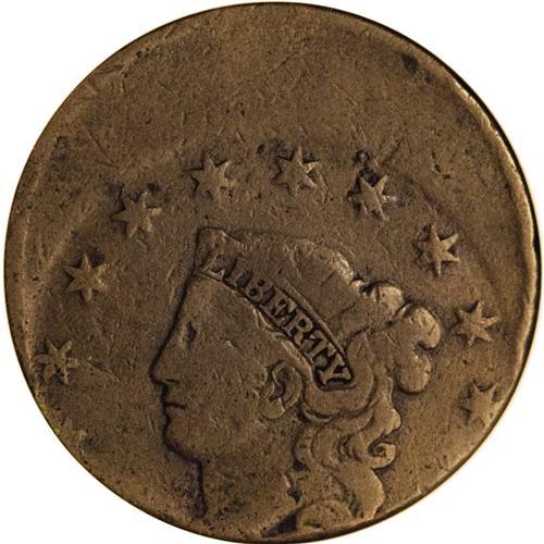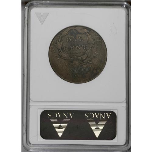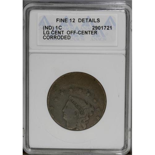 <B>Undated<1C> Matron Head Large Cent--Struck Off-Center--Corroded--ANACS. Fine 12 Details.</B></I> Likely an example of the 1831 Newcomb-1, and matching the visible diagnostics, but struck about 40% off-center toward 6 o'clock, effectively eliminating the date and stars 1-2 and 12-13. Little visible corrosion is noted on the obverse, although considerably more is seen on the reverse. Medium brown surfaces elsewhere. EAC 4.