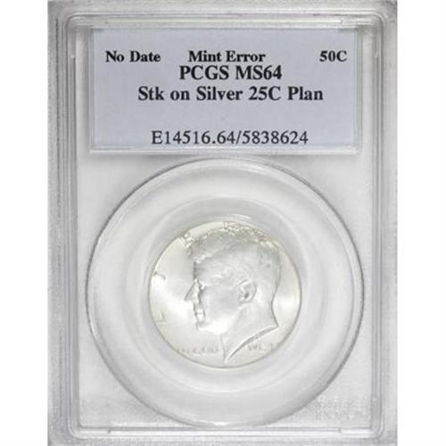 <B>Undated Half Dollar 50C --Struck on a Silver Quarter Planchet--MS64 PCGS.</B></I> The date is absent and no mintmark is present, which means that this silver piece could date from 1964 or 1965 (the Mint struck silver quarters in 1965, but dated 1964). Pleasing detail for the amount of metal with excellent eye appeal.<BR><BR><B>Coin Engraver:</B> Gilroy Roberts and Frank Gasparro<BR><BR><b>Shipping:</b> Coins & Currency (<a target="_blank" href="http://www.heritageauctions.com/common/shipping.php">view shipping information</a>)