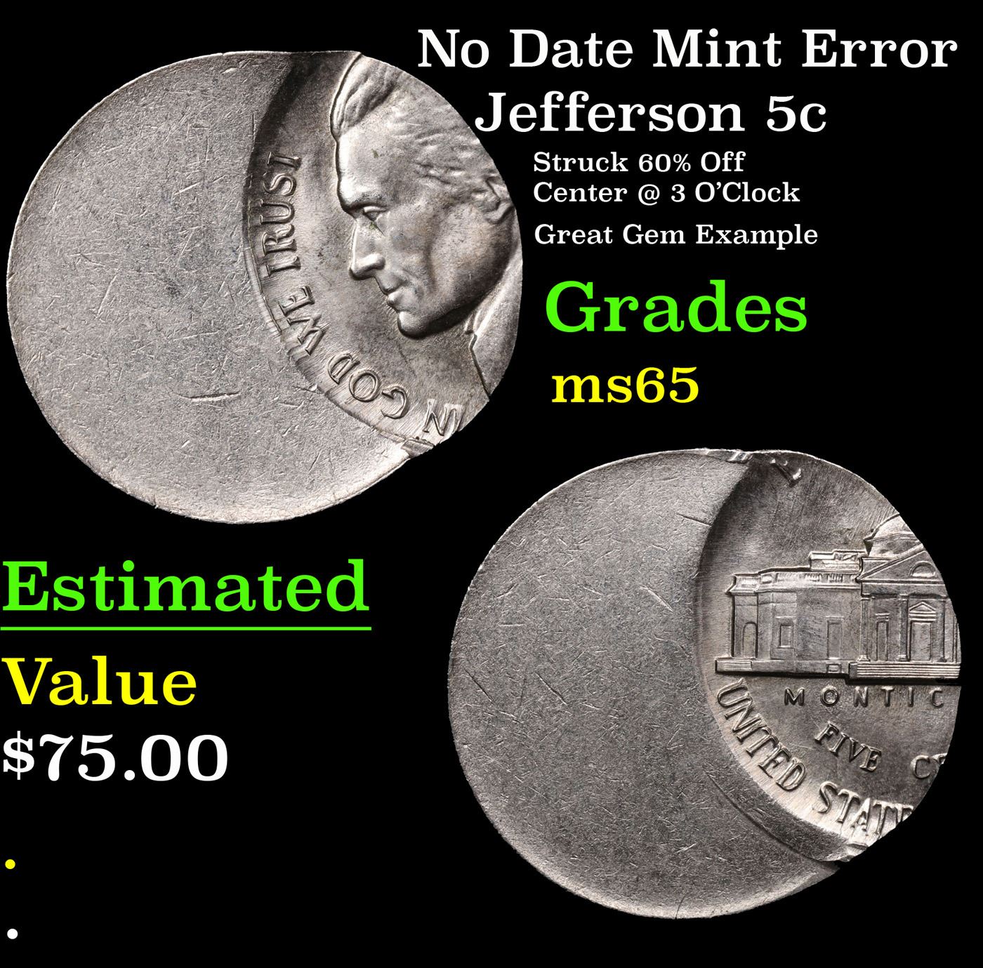 No Date Mint Error Jefferson Nickel 5c Grades GEM Unc.