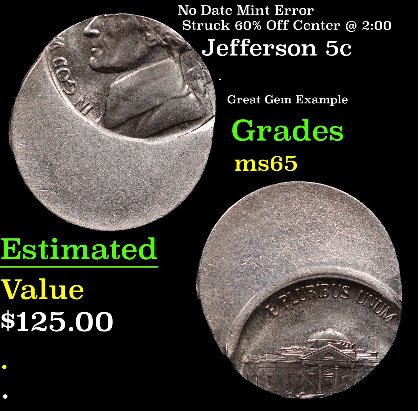 No Date Mint Error Struck 60% Off Center @ 2:00 Jefferson Nickel 5c Grades GEM Unc.
