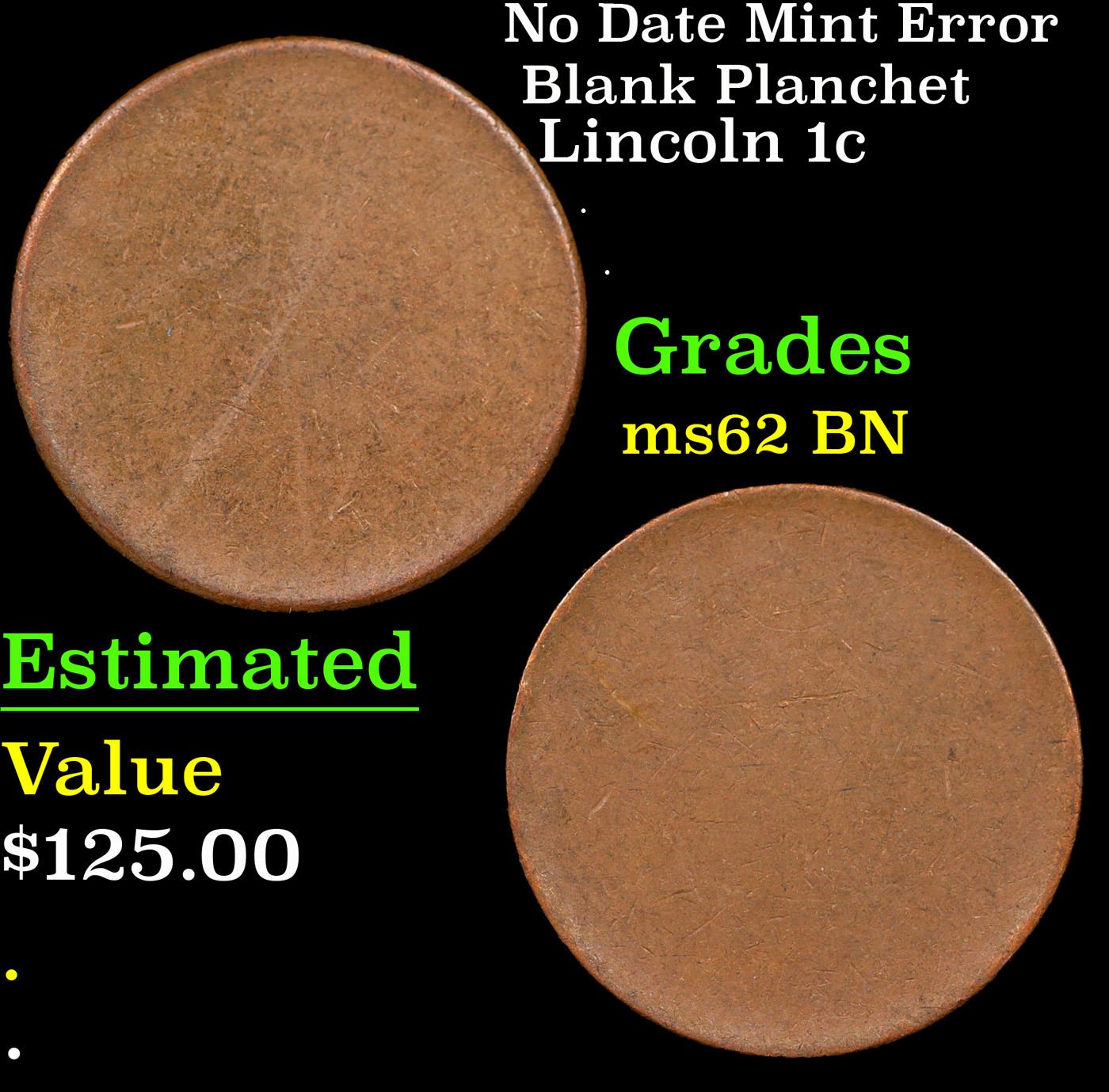 No Date Mint Error Blank Planchet Lincoln Cent 1c Grades Select Unc BN.