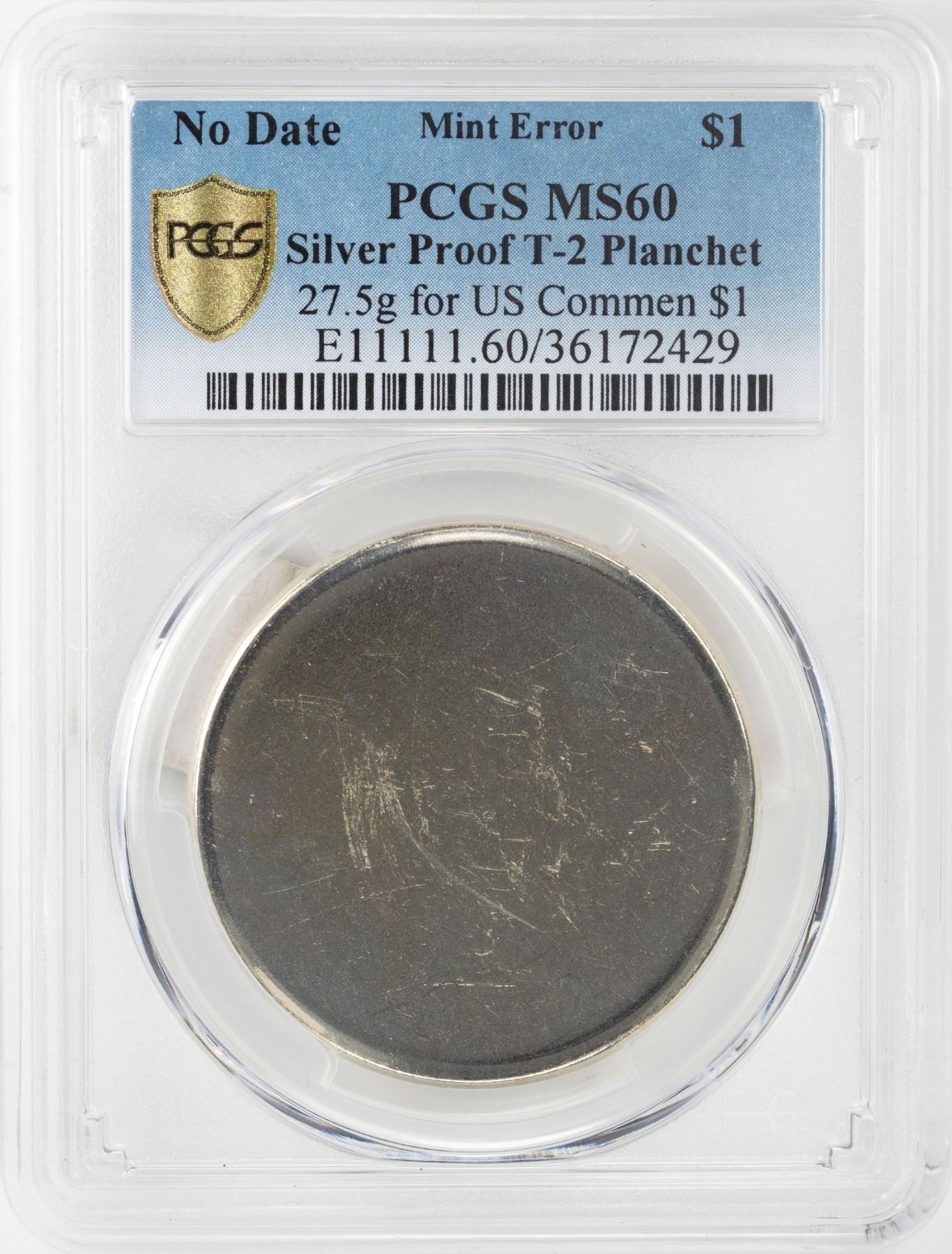 One No Date Proof $1 Mint Error T-2 Silver Planchet PCGS MS60.