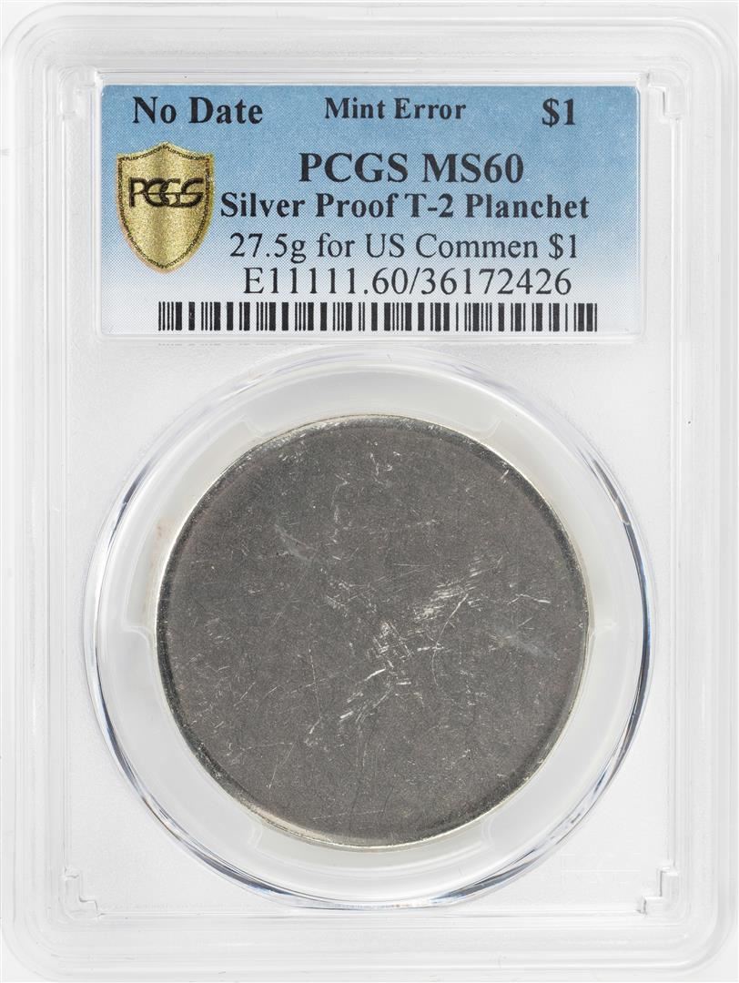 One No Date Proof $1 Mint Error T-2 Silver Planchet PCGS MS61. PCGS Graded.