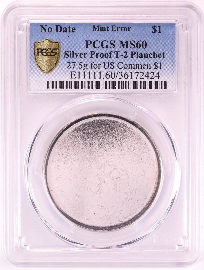 One No Date Proof $1 Mint Error T-2 Silver Planchet PCGS MS60. PCGS Graded.