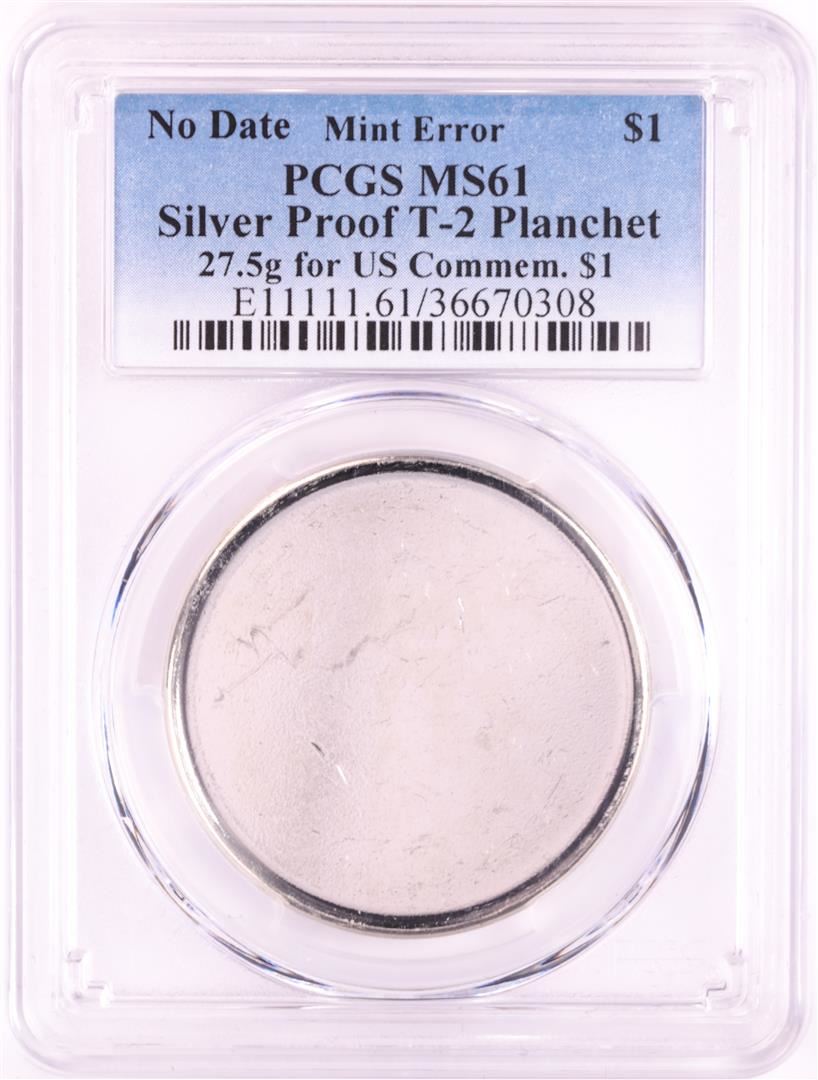 One No Date Proof $1 Mint Error T-2 Silver Planchet PCGS MS61. PCGS Graded.