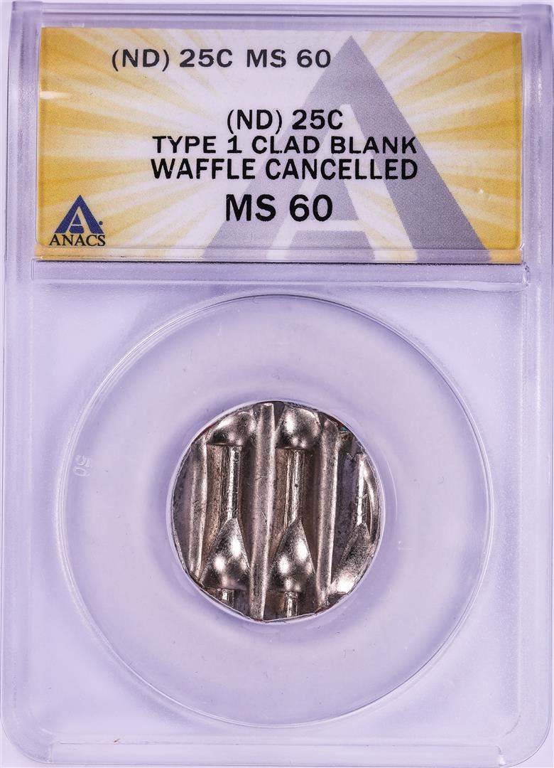 One No Date Type 1 Clad Blank Quarter Waffle Cancelled Coin ANACS MS60. ANACS Certified.