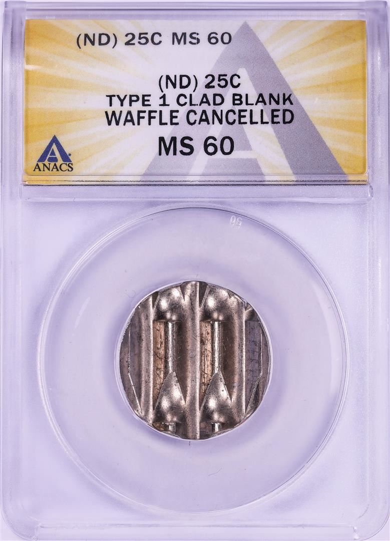 One No Date Type 1 Clad Blank Quarter Waffle Cancelled Coin ANACS MS60. ANACS Certified.