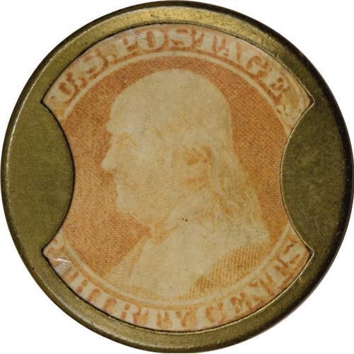 <B>HB-139 EP-178 Scott-100 Reed-JG30 30¢ J. Gault Extremely Fine.<BR>Numerical grade: 65case.75stamp.80mica = 220</B></I> The case has been lightly cleaned, but it is otherwise flawless. The stamp is perfectly centered, with decent but not quite full color, and the mica is crystal clear with its only problem being a small craze immediately below the left tab. A very nice example of this elusive high denomination.<BR><I>From The Frederick Mayer Collection</B></I><BR><BR><b>Shipping:</b> Coins & Currency (<a target="_blank" href="http://www.heritageauctions.com/common/shipping.php">view shipping information</a>)