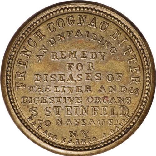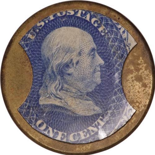 <B>HB-221 EP-27 Scott-165 Reed-ST01 1¢ S. Steinfeld Choice About New.<BR>Numerical grade: 85case.75stamp.75mica. = 235</B></I> Although this One Cent is considered an R-7 by Reed, indicating eleven to fifteen known, it is by far the most common of the Steinfelds. Fred Reed's 104-year auction survey shows that, of 75 total appearances of Steinfeld encasements at auction, 57 of those appearances were One Cent pieces. This figure, of course, includes very heavy duplication. Mr. Mayer pedigrees this lovely piece to a February 1969 Stack's sale. The piece is a gorgeous high-end AU, with a touch of silver behind the letters. The stamp is fresh, save for a minor toned area at the bottom center, and the mica shows just very minor crazing at it outers edges, but it is completely clear. Steinfeld is one of the most difficult merchants to acquire, with this 1¢ piece the only generally available denomination.<BR><I>From The Frederick Mayer Collection</B></I><BR><BR><b>Shipping:</b> Coins & Currency (<a target="_blank" href="http://www.heritageauctions.com/common/shipping.php">view shipping information</a>)