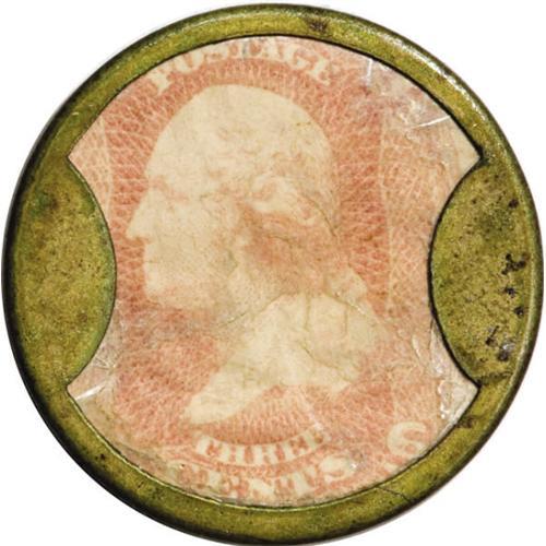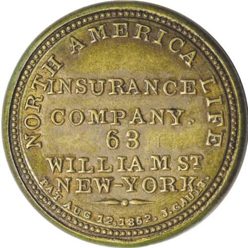 <B>HB-190 EP-53 3¢ North America Life Insurance About New.</B></I> The case is lovely, with virtually no signs of wear, and the word "Insurance" is straight. The stamp is slightly faded and the mica has a number of small cracks and craze lines.<BR><BR><b>Shipping:</b> Coins & Currency (<a target="_blank" href="http://www.heritageauctions.com/common/shipping.php">view shipping information</a>)