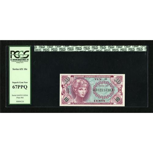 <B>Series 651 10c PCGS Superb Gem New 67PPQ.</B></I> Perfectly margined with excellent front to back centering. <BR><BR><b>Shipping:</b> Coins & Currency (<a target="_blank" href="http://www.heritageauctions.com/common/shipping.php">view shipping information</a>)