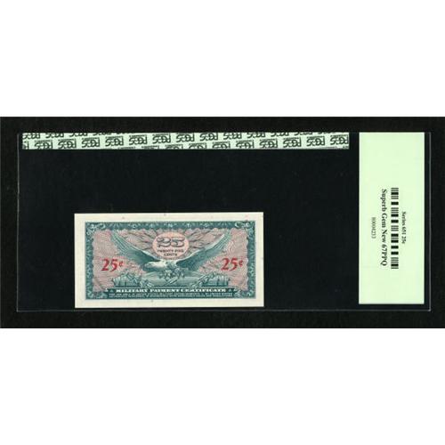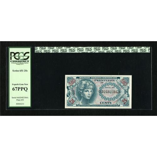 <B>Series 651 25c PCGS Superb Gem New 67PPQ.</B></I> Bold purple color contrasts nicely against the bright white paper. <BR><BR><b>Shipping:</b> Coins & Currency (<a target="_blank" href="http://www.heritageauctions.com/common/shipping.php">view shipping information</a>)