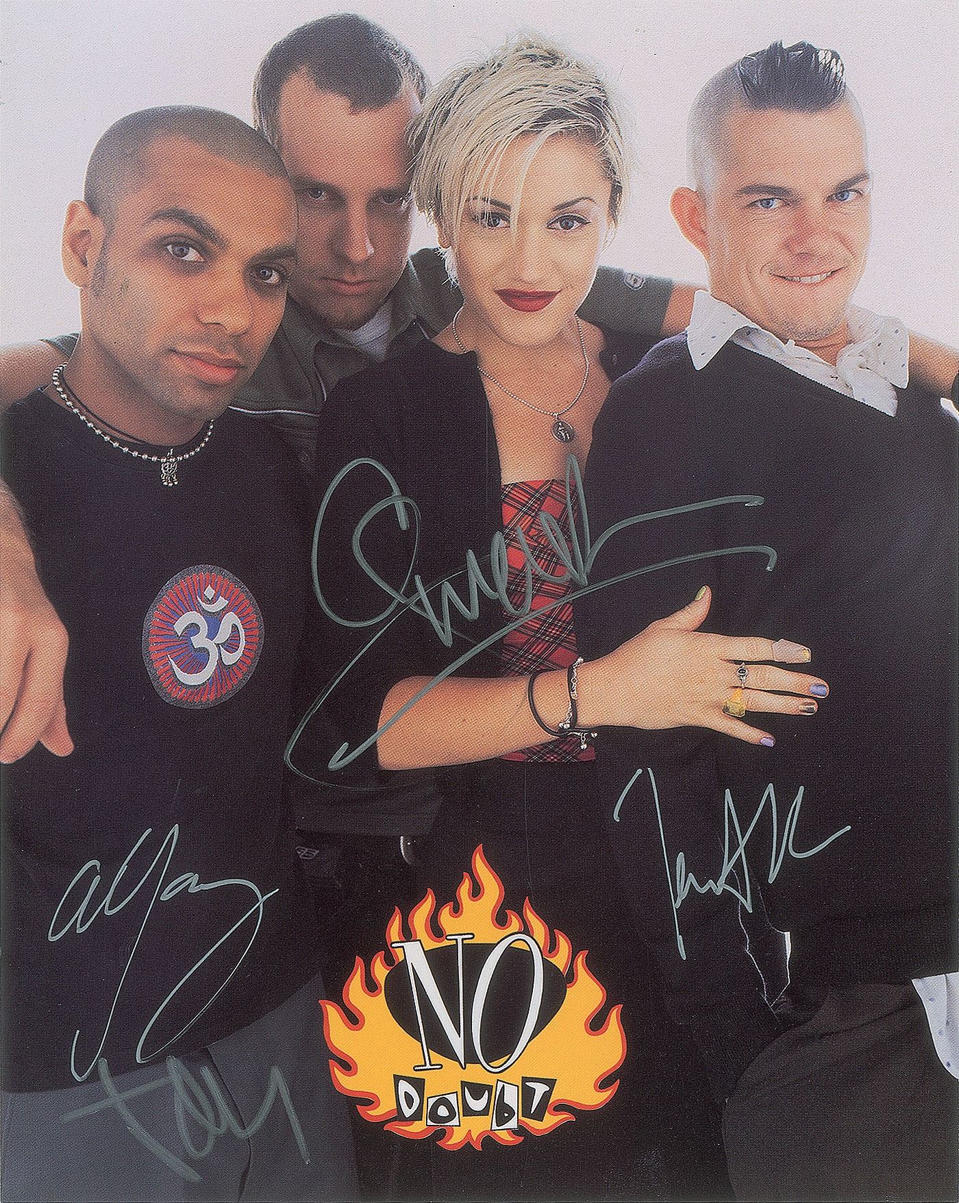 Color semi-glossy 8 x 10 cardstock photo of No Doubt, signed in silver ink by Gwen Stefani, Tom Dumont, Tony Kanal, and Adrian Young. In very fine condition. Accompanied by a full letter of authenticity from JSA.