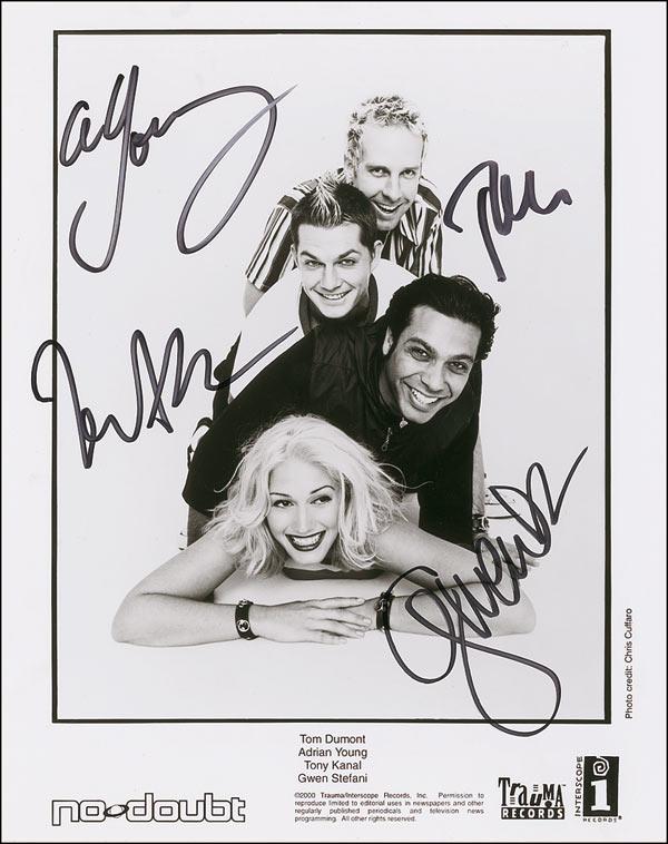 Satin-finish 8 x 10 Trauma Records promotional photo of the group in a pyramid with Stefani smiling widely at the bottom, signed in black felt tip by Gwen Stefani and Tom Dumont, both signing first name only, Tony Kanal, and also signed by Adrian Young, “A. Young.” In fine condition.