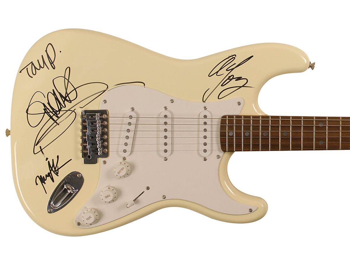 Cream-colored Fender Squier ‘stratocaster-style’ electric guitar, signed in person on the body in black felt tip by Gwen Stefani, Tom Dumont, Tony Kanal, and Adrian Young. In fine condition. Originally obtained by in-person specialist Mike Wehrmann. Overs