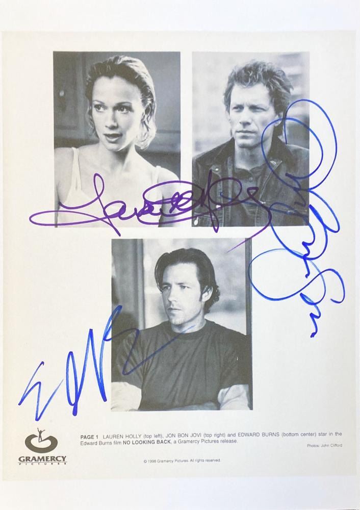 No Looking Back cast facsimile signed movie photo autographed by Ed Burns, Lauren Holly and Jon Bon Jovi. 8x10 inches. This item is a reprint of an original autograph