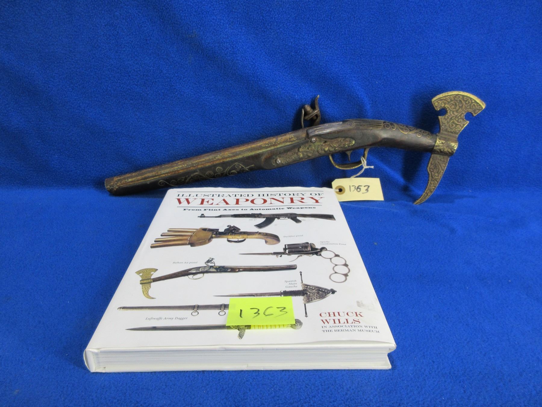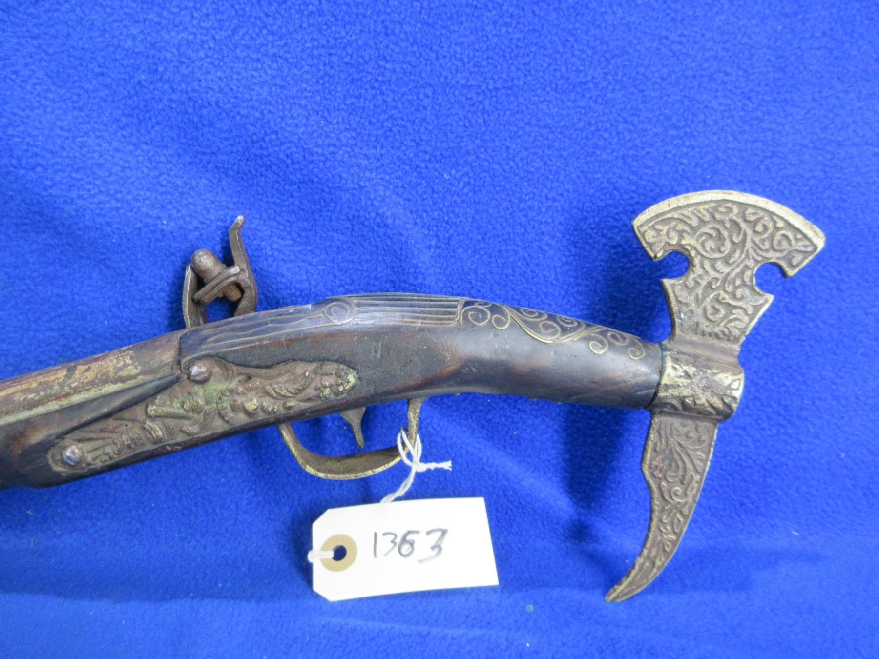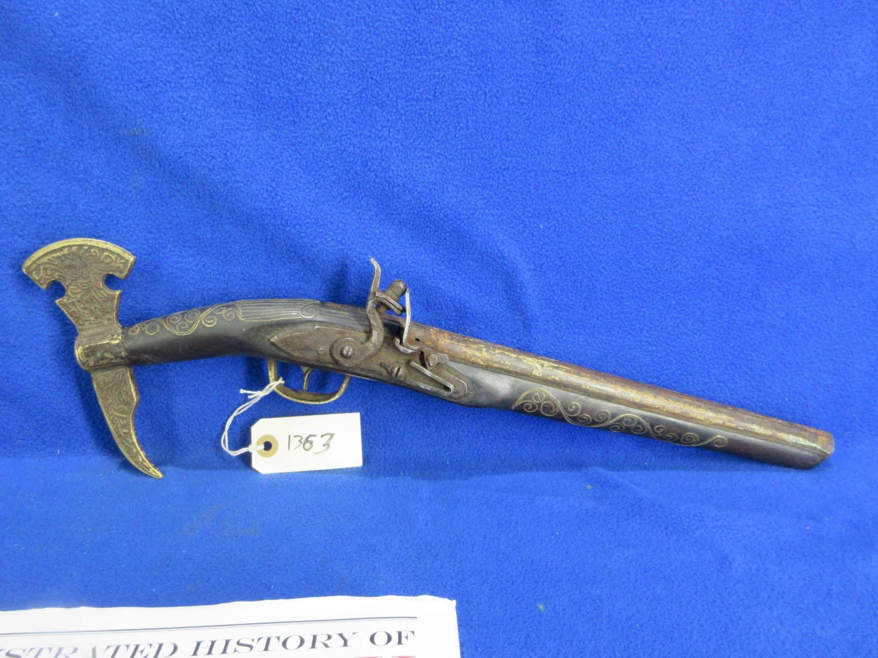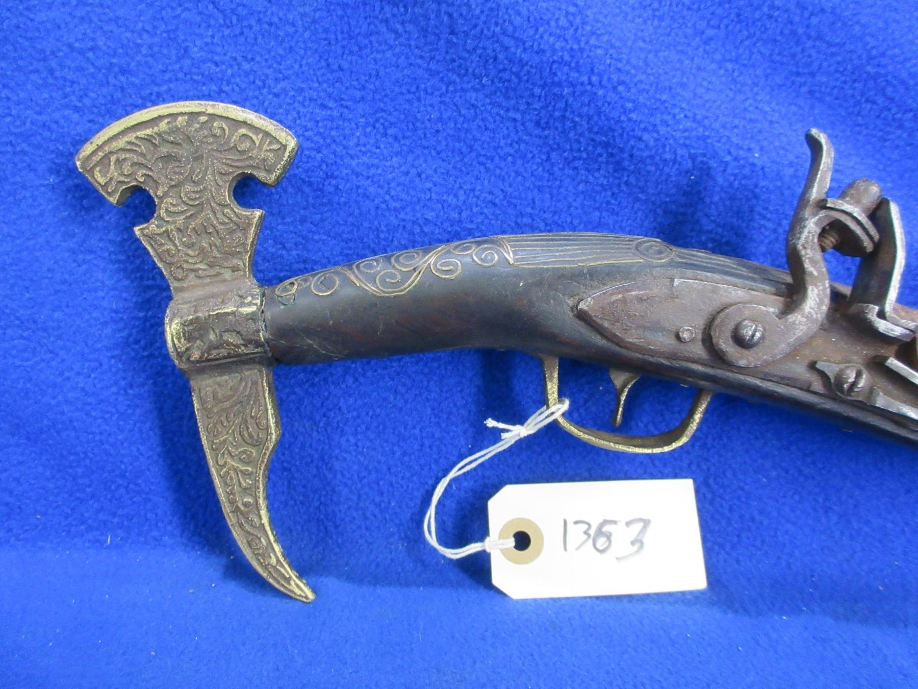 No PAL Required - Replica Balkan Axe Pistol - This is a replica flintlock single-shot pistol, action functions - does cock and fire but there is no powder area in the flash pan. Barrel is 11". Brass trigger guard, back plate of the lock is cast brass, brass casted axe is nicely embellished . Stock is pop riveted to the barrel and can been seen in the barrel. Stock and barrel are inlaid with wire. Comes with History of Weaponry Book showing a similiar item on the cover. Ser #None