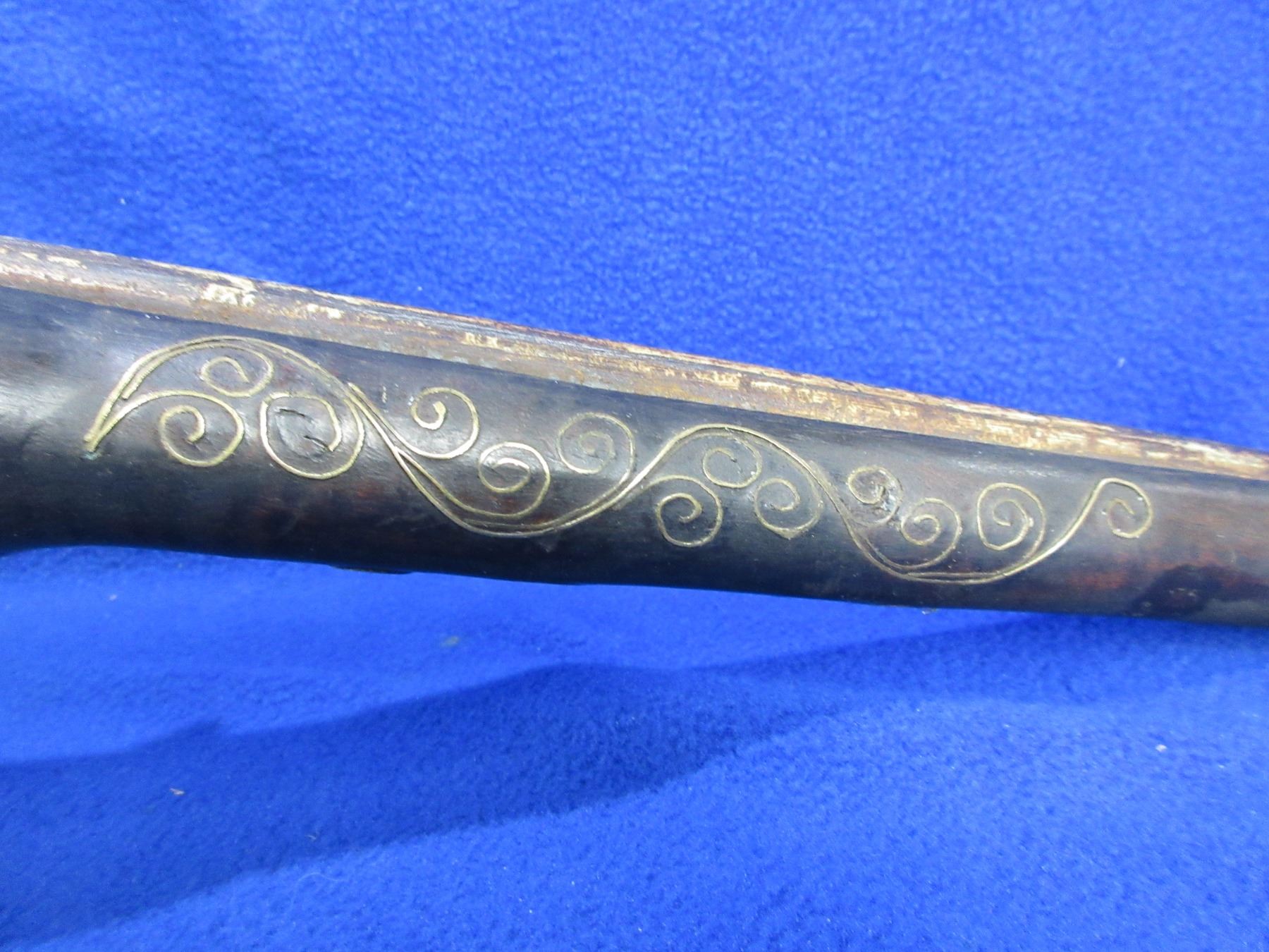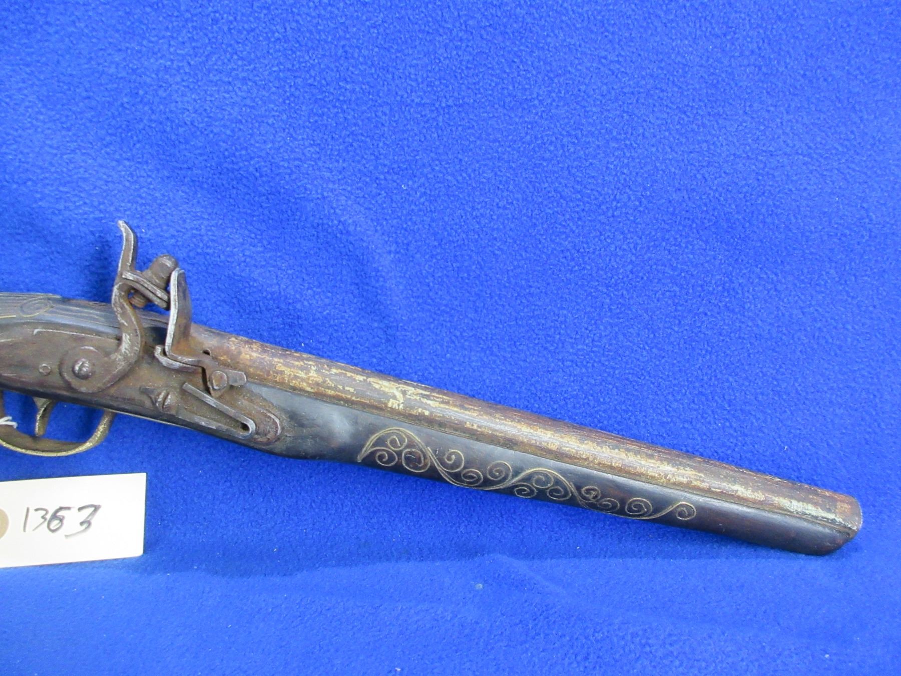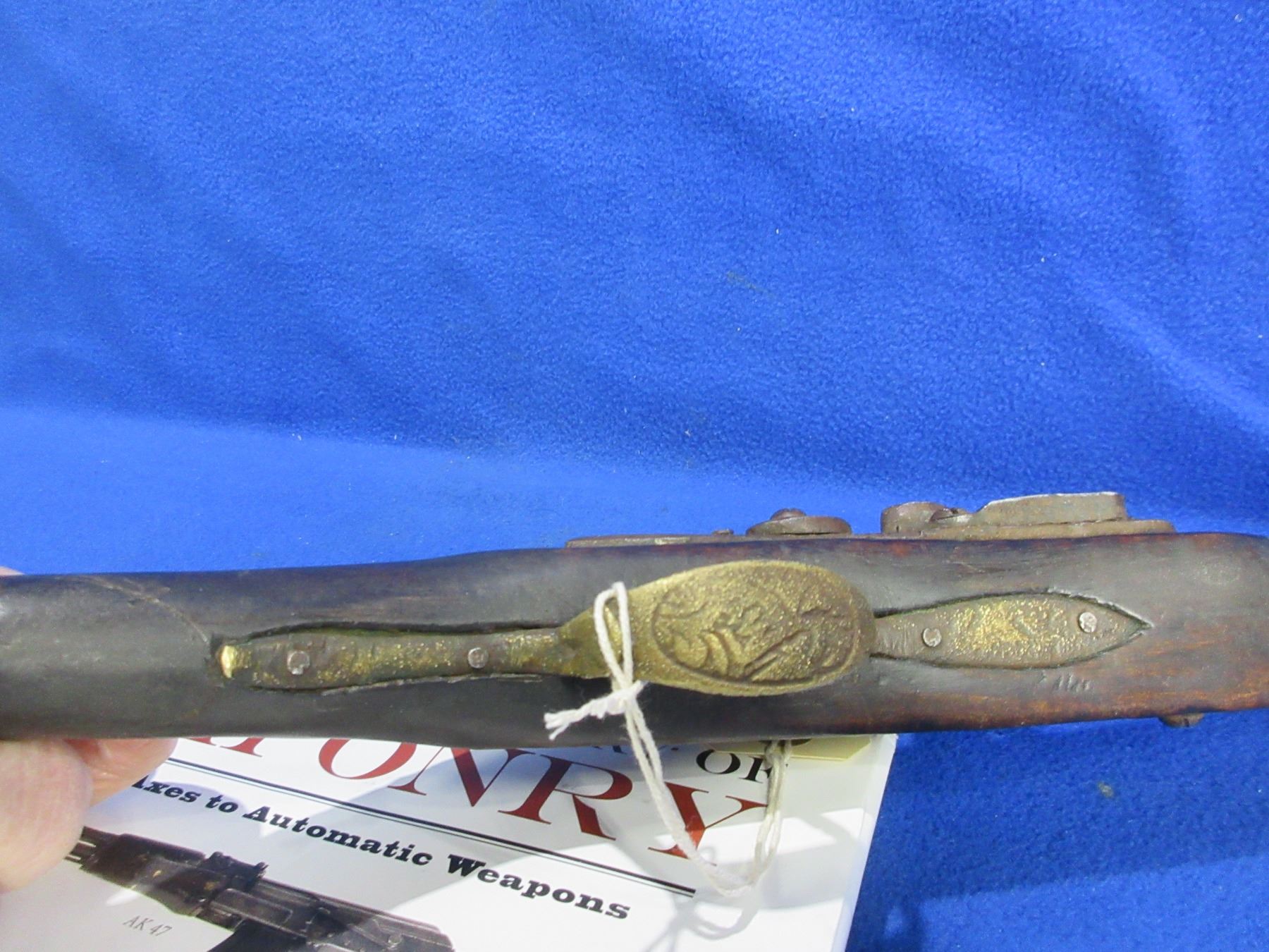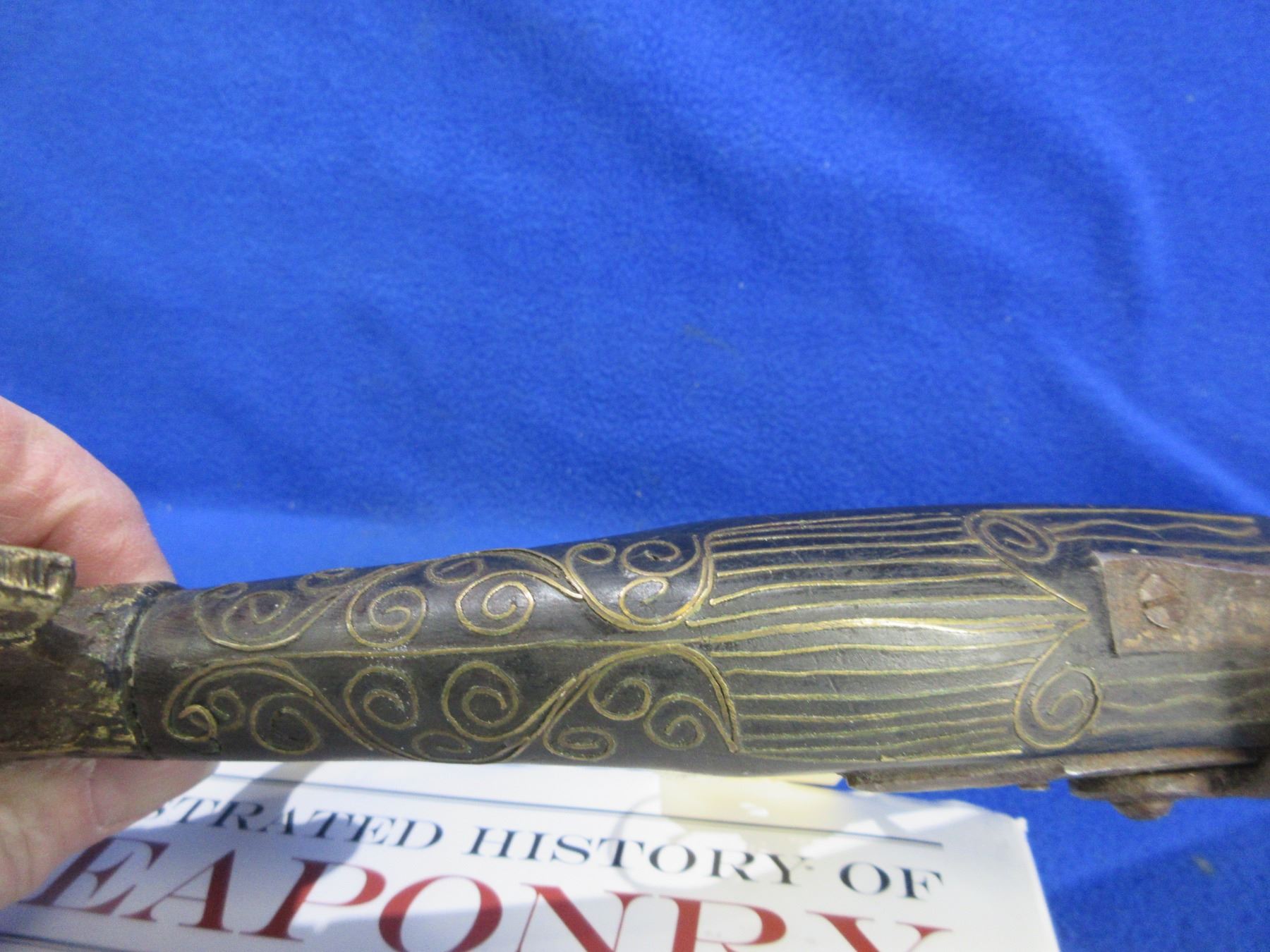 No PAL Required - Replica Balkan Axe Pistol - This is a replica flintlock single-shot pistol, action functions - does cock and fire but there is no powder area in the flash pan. Barrel is 11". Brass trigger guard, back plate of the lock is cast brass, brass casted axe is nicely embellished . Stock is pop riveted to the barrel and can been seen in the barrel. Stock and barrel are inlaid with wire. Comes with History of Weaponry Book showing a similiar item on the cover. Ser #None
