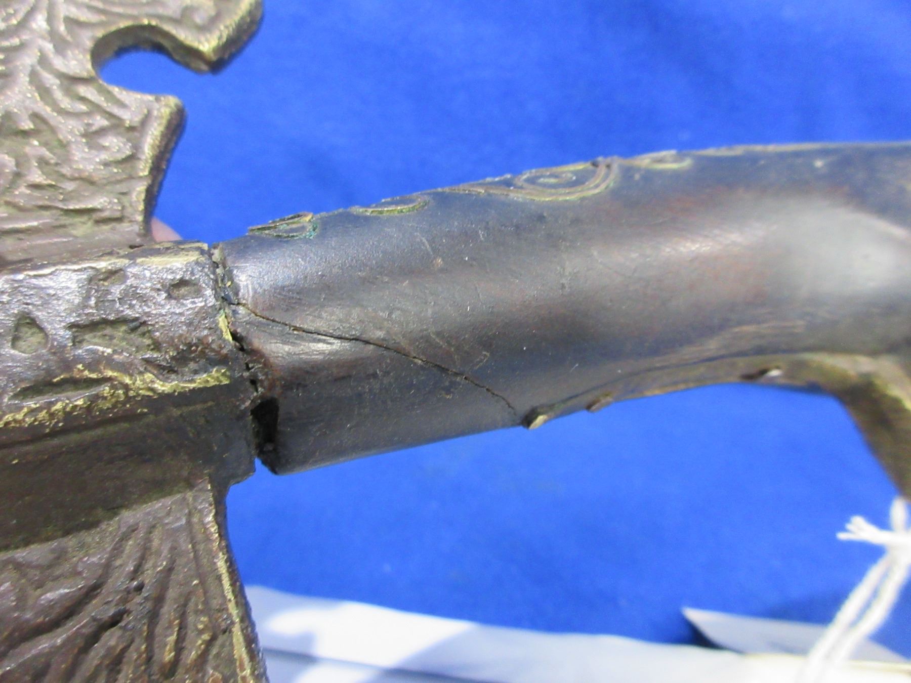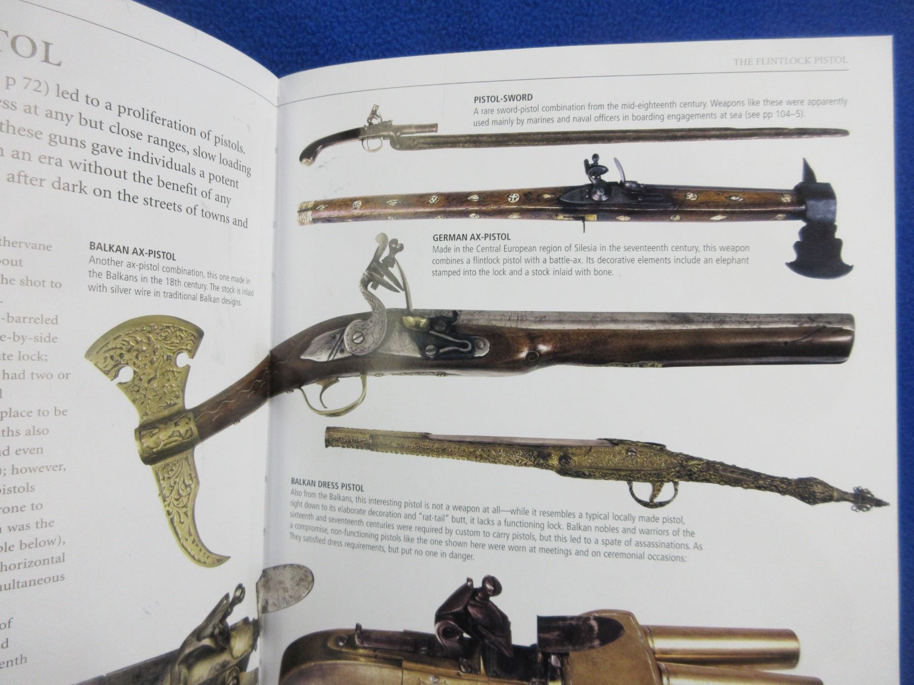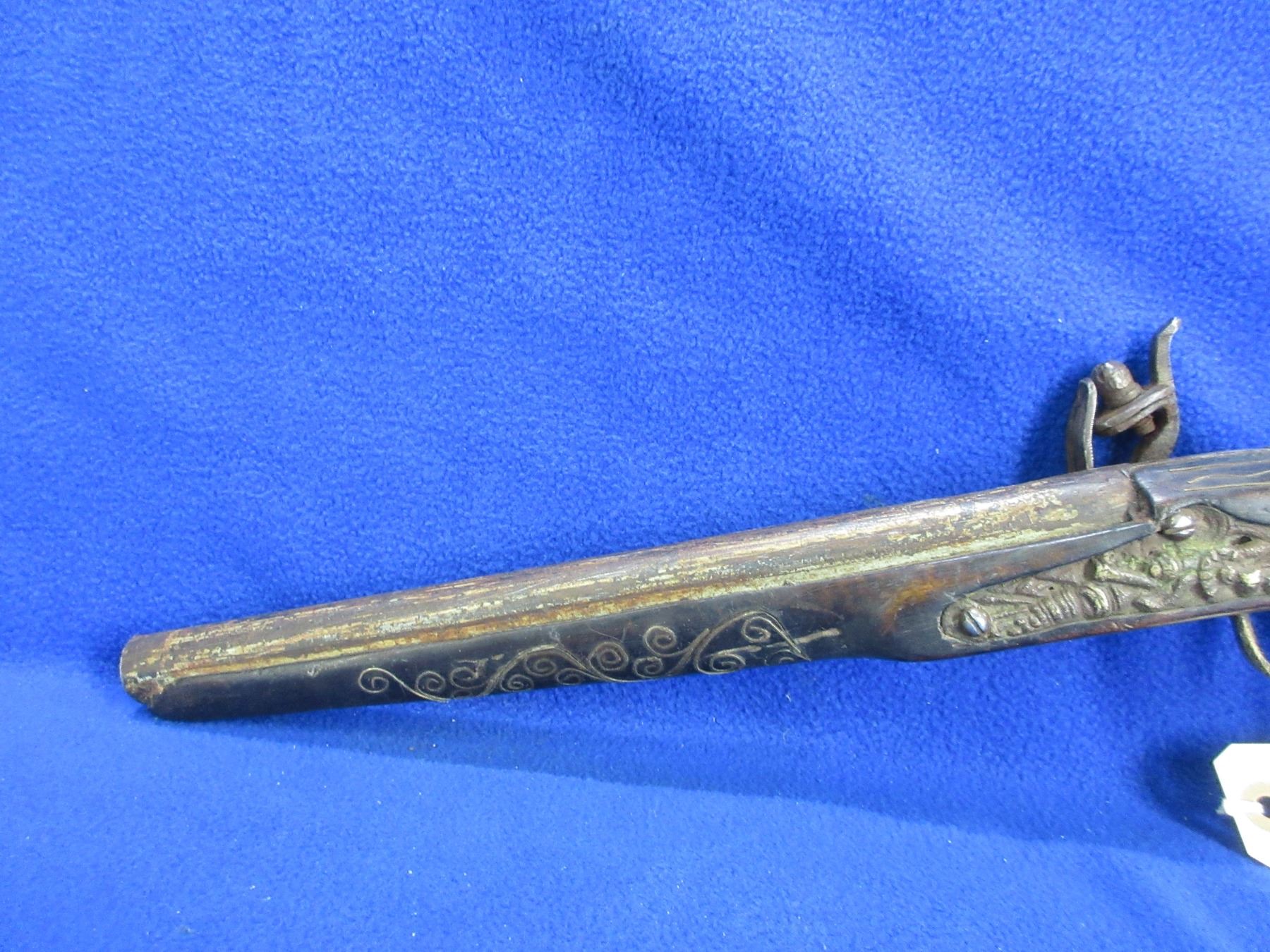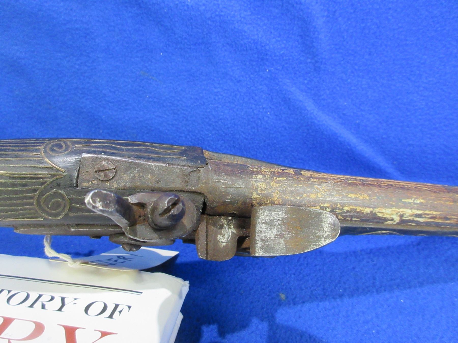 No PAL Required - Replica Balkan Axe Pistol - This is a replica flintlock single-shot pistol, action functions - does cock and fire but there is no powder area in the flash pan. Barrel is 11". Brass trigger guard, back plate of the lock is cast brass, brass casted axe is nicely embellished . Stock is pop riveted to the barrel and can been seen in the barrel. Stock and barrel are inlaid with wire. Comes with History of Weaponry Book showing a similiar item on the cover. Ser #None