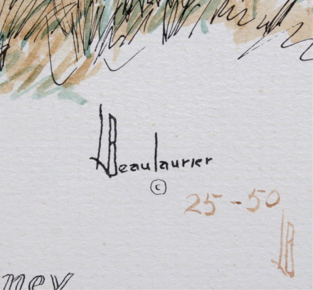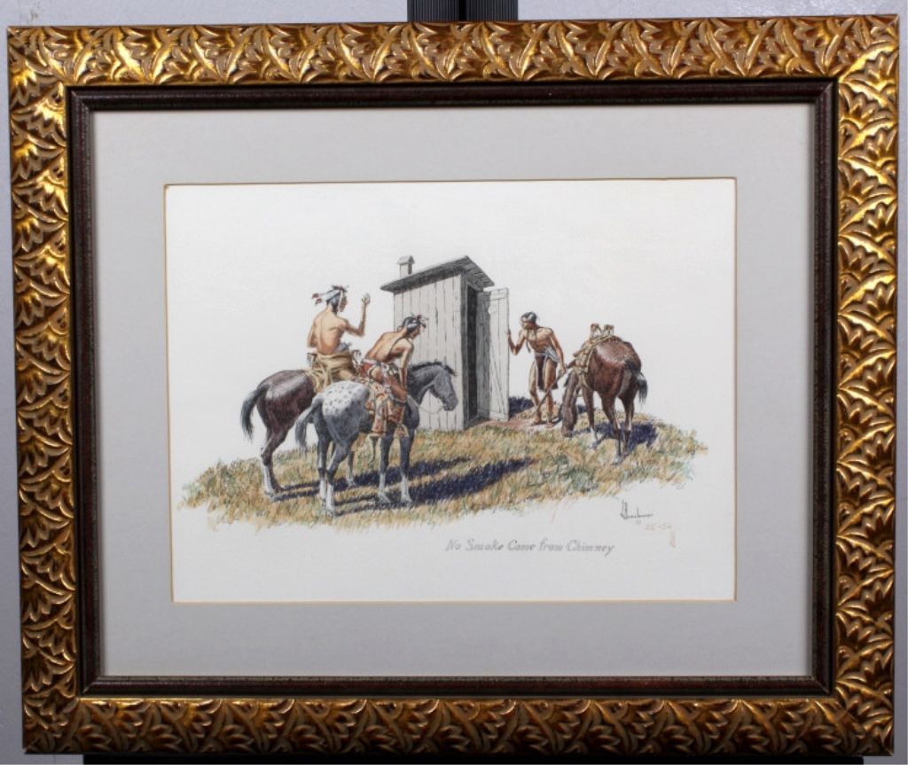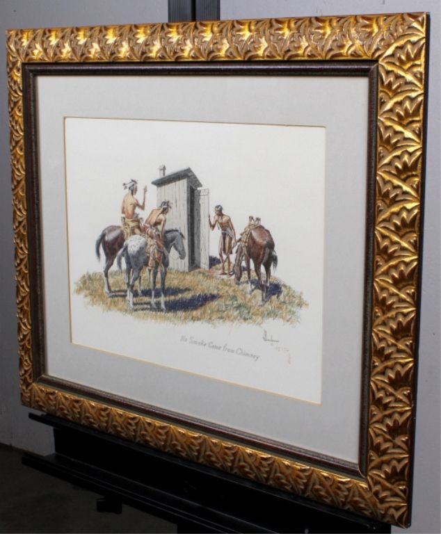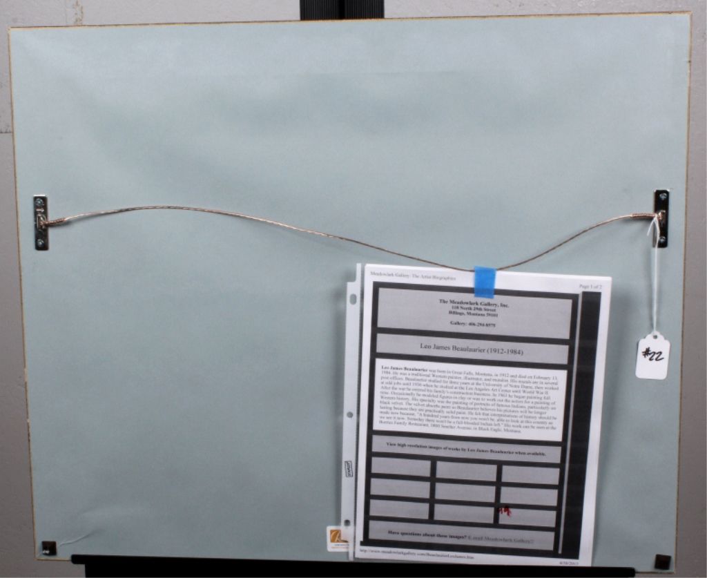 This is a hand painted Lithograph done by Leo J. Beaulaurier. Leo was a student of the famed Western Artist Charles M. Russell. This piece shows wonderful details of a Native American scene. He has done many different works in prominent Montana places and is a historic Great Falls, Montana Artist. This piece is hand painted and signed by the artist and is numbered 25/50. The title is "No Smoke Come From Chimney." The frame measures 20"x24" and the art is 11.5"x15.5"
