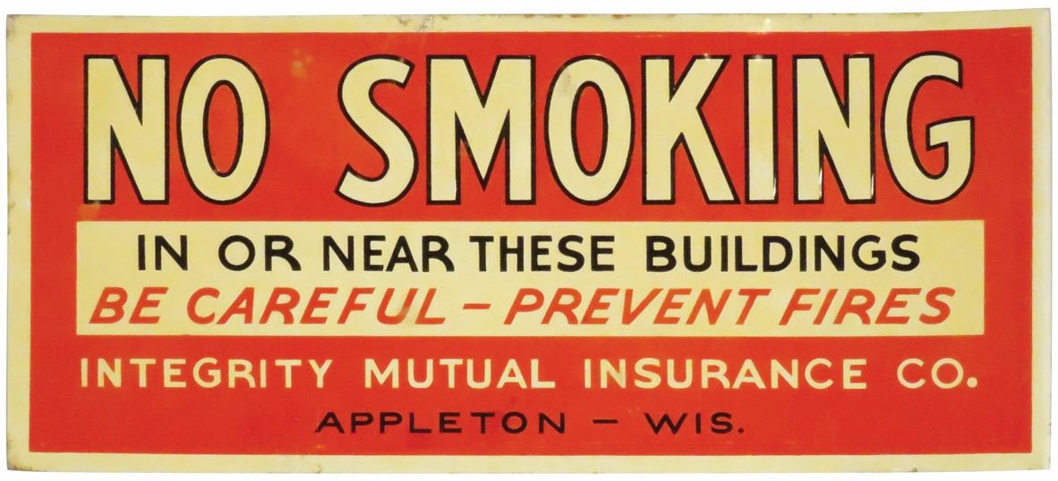 No Smoking Embossed Tin Sign. Intergrity Mutual Insurance Co. Light edgewear otherwise excellent condition. 9 7/8 X 4 1/2 inches.