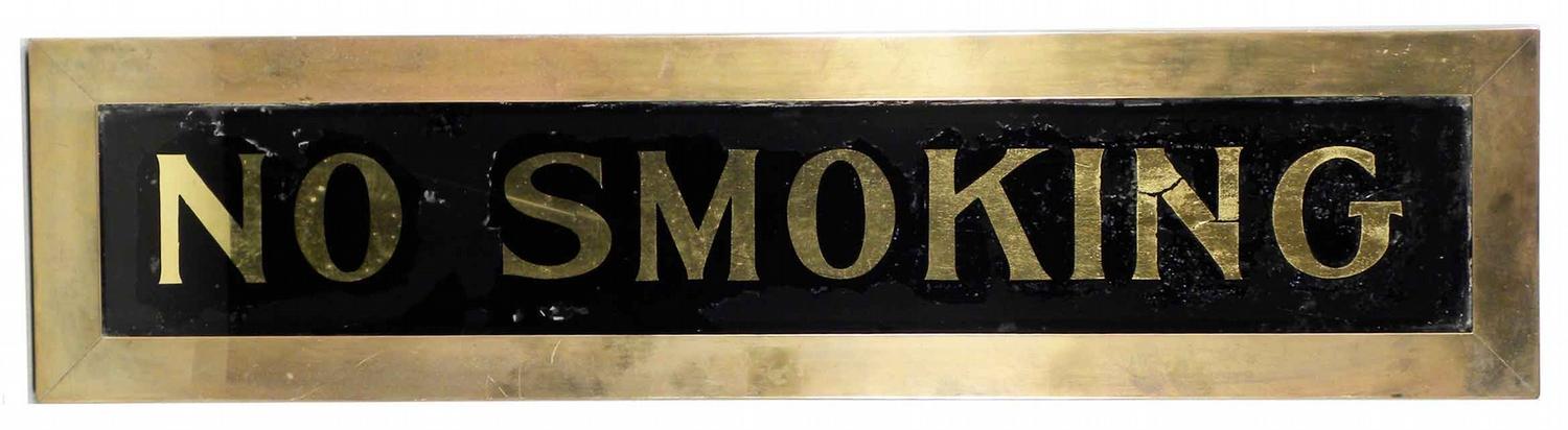No Smoking Reverse Glass Sign in original brass frame. Minor paint lifting in several places otherwise good condition. 22 1/2 X 5 1/2 inches overall.