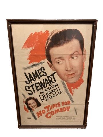 "No Time For Comedy" starring James Steward and Rosalind Russell original, framed Litho movie poster. Poster has been protected by the frame for many years as this hung on the walls of the Debbie Reynolds Dance Studio. Re released by Warners. #23658.